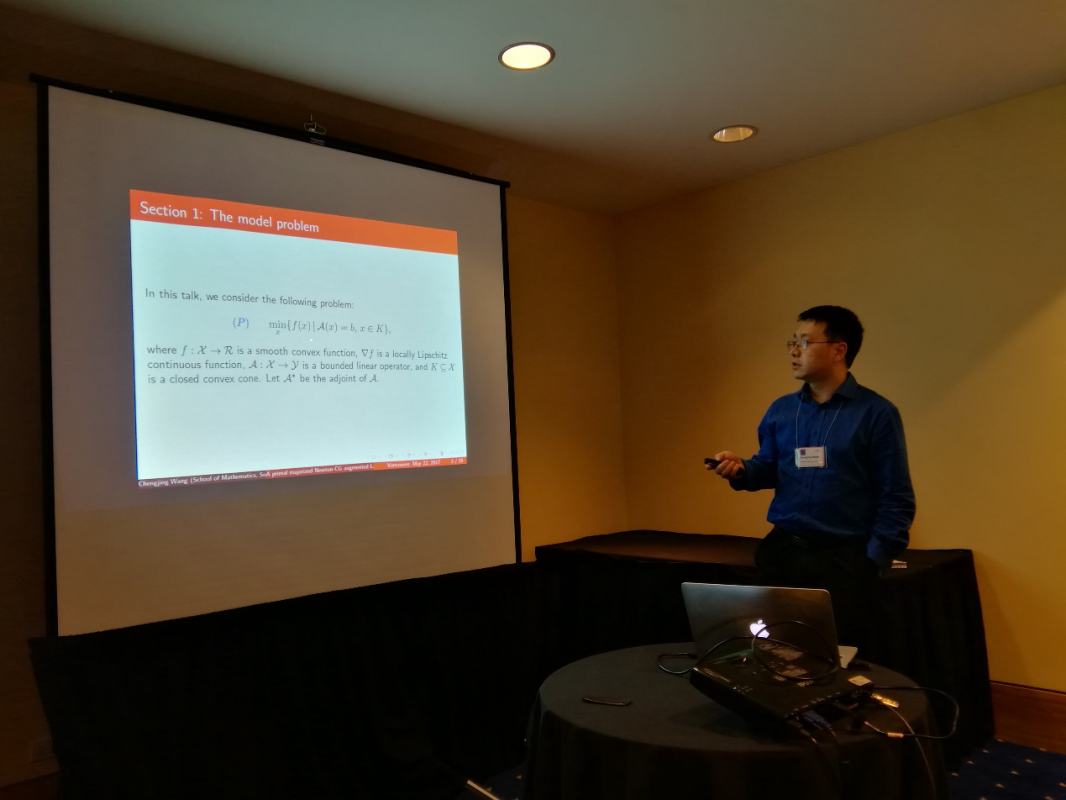 王承竞老师于2017年5月20-27日参加了在加拿大温哥华举行的SIAM Optimization 17大会。该会议是美国工业与应用数学学会每三年一届的大会。国际上众多优秀的优化学者出席了这次世界级的数学优化盛会,报告了数学规划各个分支领域最新的理论研究进展,以及各分支学科在各个领域的实际应用。王承竞老师作了题为“A primal majorized Newton-CG augmented Lagrangian method for large-scale linearly constrained convex programming”的学术报告。王承竞,2010年于新加坡国立大学博士后出站来到我院工作,主要研究方向为大规模矩阵优化的理论及算法设计,统计学习算法设计等,已发表论文13篇,曾主持国家自然科学青年基金一项。