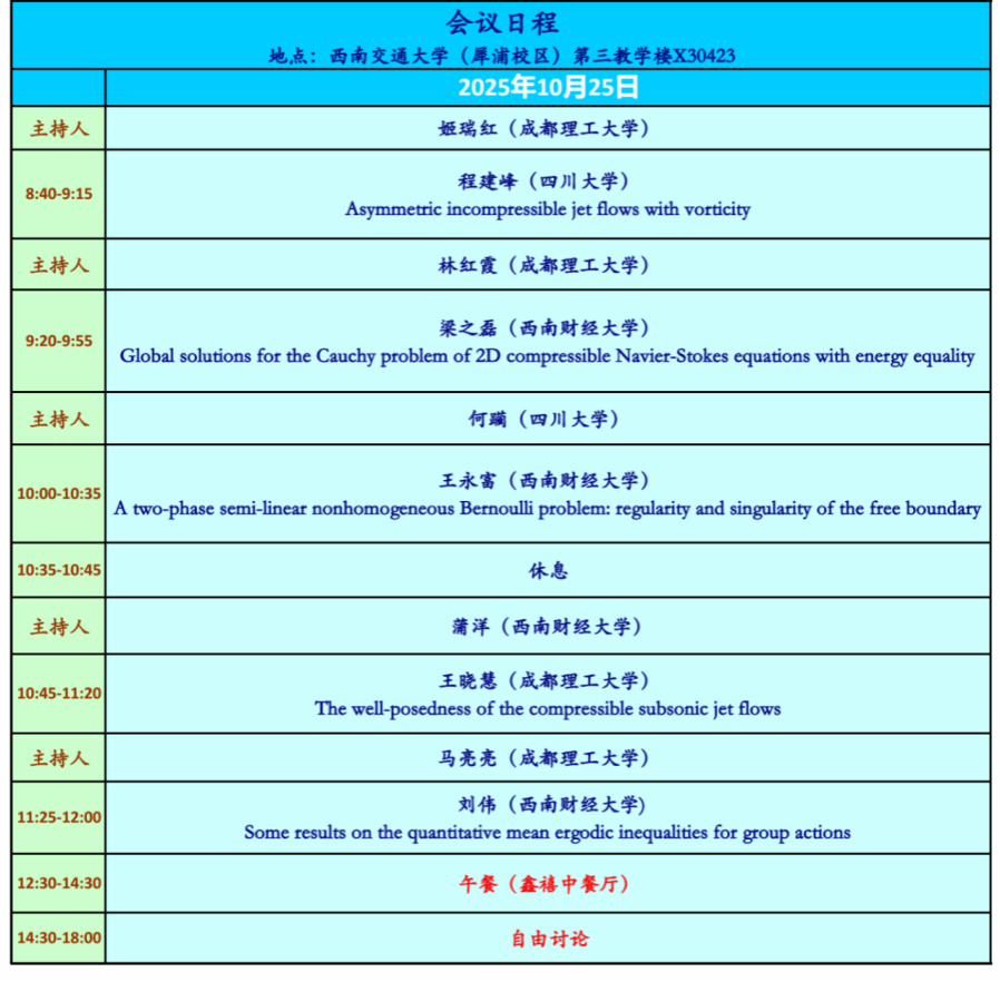 为了促进网飞猫 数学学科建设及川内同行在流体力学方程领域的学术交流,展示最新研究成果,网飞猫 主办的“2025年天府流体力学方程研讨会”将于 2025年10月25日在网飞猫 犀浦校区举办。本次会议旨在将川内流体力学方程领域的专家学者们召集起来,就当前流体力学方程领域的前沿课题及最新成果进行深入而广泛的交流,提高西部地区的学术影响力,活跃地区学术氛围。安排如下: