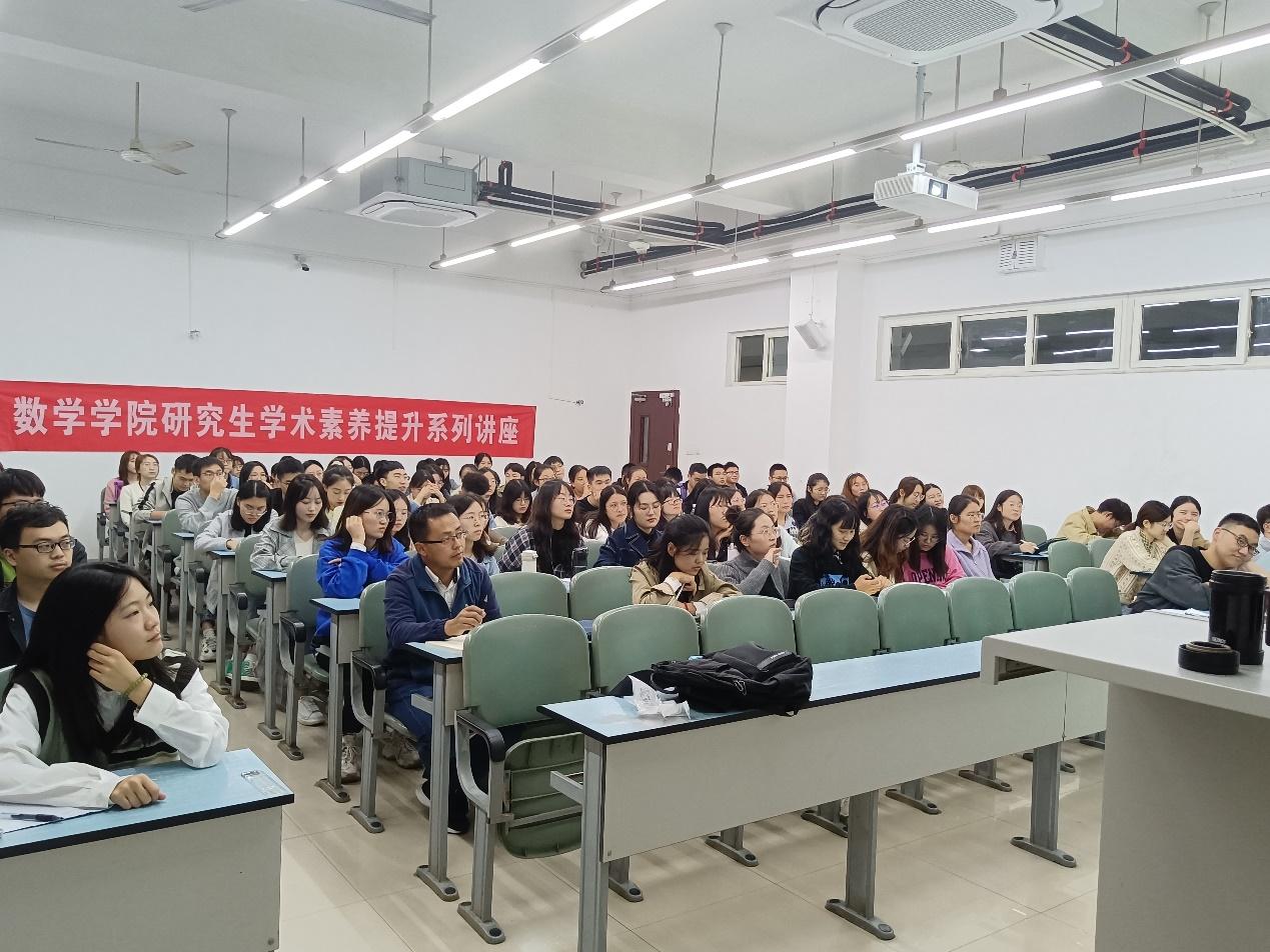 在主持人的介绍下,黄磊老师开始了关于研究生培养规范进行的指导交流。首先介绍了中国数学会期刊目录,其中包括:数学类共173 种期刊、概率统计类共62 种期刊、应用数学类共91 种期刊以及跨学科应用数学类共59 种期刊。黄磊老师主要讲解了各个具体方向的前沿期刊,以及在后续论文写作完成后投稿时需要注意的问题。接着黄磊老师从论文写作入手,介绍了论文写作时需要注意的问题。比如论文要有框架,内容要有侧重点,文章的亮点要突出清楚。写文献综述时要开门见山,在总结前人工作的基础上,解释清楚自己所做的工作等等。最后,黄磊老师提出在读研期间同学们应广泛阅读文献,寻找自己感兴趣的课题,学习前沿的方法并理解,再加以实操。同学们认真聆听,为将来发表学术论文打下了基础。