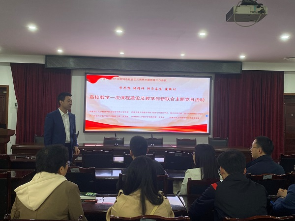 教工信息与计算科学系党支部、教工统计系党支部联合四川师范大学数学科学学院教工第二党支部、成都理工大学数理学院基础数学教学教工党支部、四川省现场统计学会党支部于2023年4月22日在成都理工大学数理学院举行了“学思想 强党性 重实践 建新功——高校数学一流课程建设及教学创新联合主题党日活动。该主题党日活动依托“第二届高校数学一流课程建设及教学创新论坛”举办,研讨会由成都理工大学数理学院基础教学部党支部书记舒畅主持。网飞猫