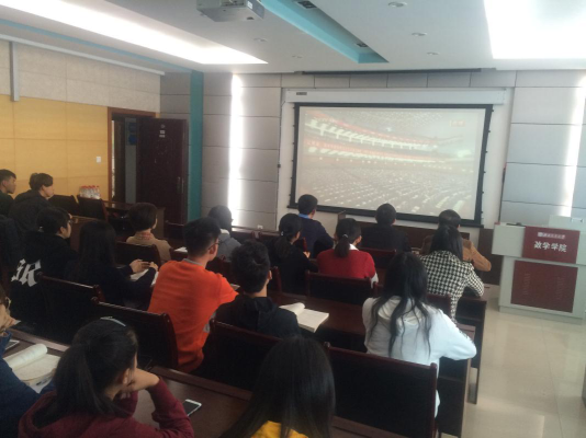 党委委员,常务副院长杨晗同志,党委委员,副院长潘小东同志,党委委员,学生工作组组长杨育鸿同志,学院机关各办公室老师,全体辅导员和学生党员代表在犀浦校区学院会议室X2511观看了中国共产党第十九次全国代表大会开幕会。