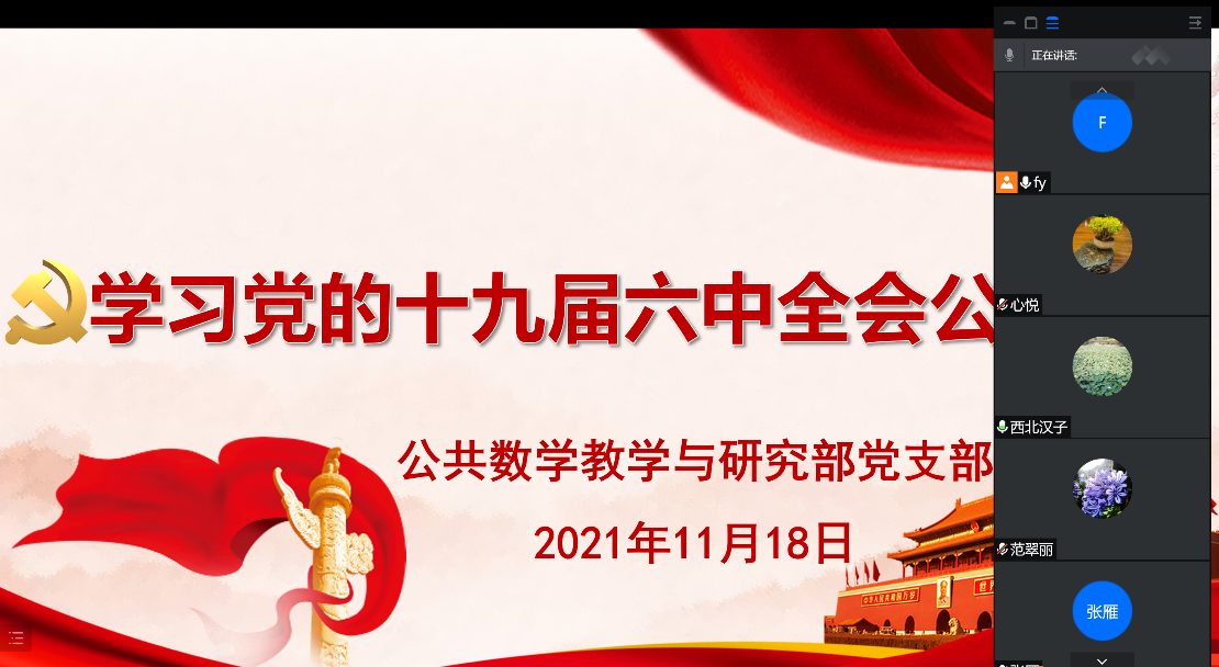 为学习贯彻党的十九届六中全会精神,11月18日下午公共数学教学与研究部教工党支部组织支部全体党员教师在线开展了《中国共产党第十九届中央委员会第六次全体会议公报》专题学习活动,传达党的十九届六中全会精神,原原本本学习全会公报。