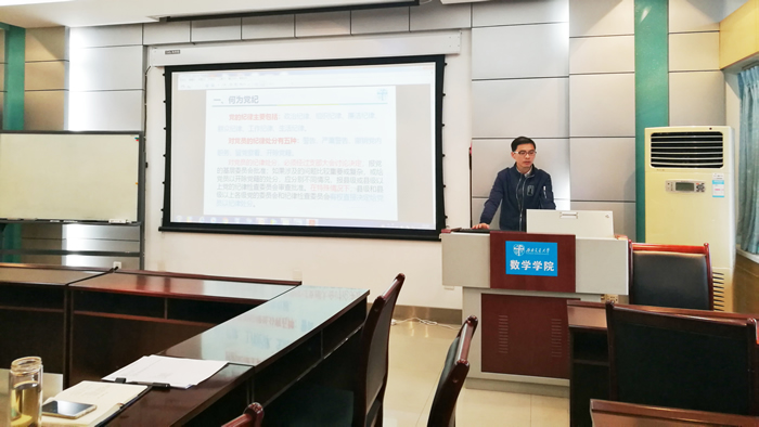 在主讲《条例》中,杨育鸿传达了中纪委和学校对学习宣传、贯彻落实《条例》的明确要求。结合党章中党纪有关内容,讲解了何为党纪、有哪些党纪、党纪处分有哪些种类等基本知识点。在讲到《条例》修订内容时,对新修订情况做了详细讲些,突出讲解了修订后的八个亮点,即一个思想、两个坚决维护、三个重点、四个意识与四种形态、五处纪法衔接、六个从严、七个有之、八种典型违法行为。