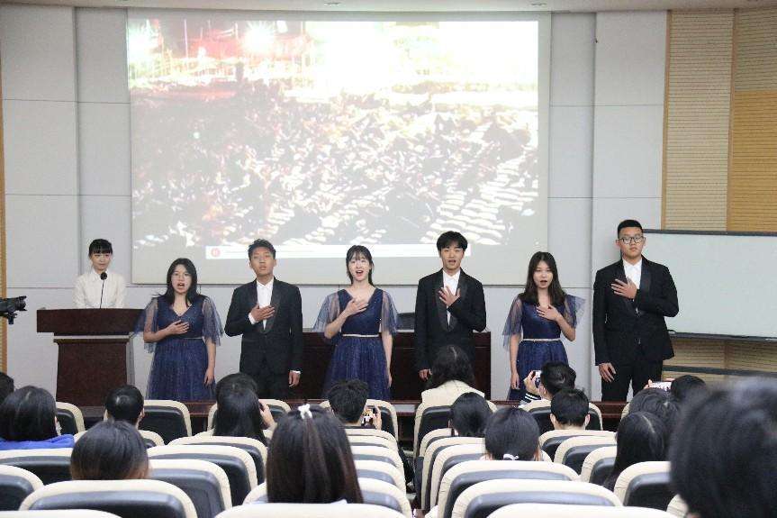 主题班会上,阵阵悠扬悦耳的歌声不断传出,吸引了很多同学驻足,进来旁听的同学越来越多。原来,这是“音乐里的故事”讲演团正在演绎《我和我的祖国》。