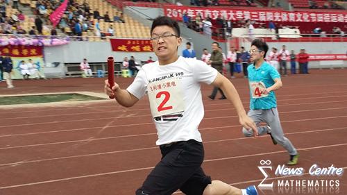 人感到了由衷的自豪!四位男生从第一棒到最后一棒的冲刺都令人惊叹,尤其是最后一棒的14级张译同学,让在场的同学忍不住起身为他呐喊。最终,男子4×100接力勇夺全校第二名的好成绩!第一名是外国友人留学生齐萨巴,这个黑色皮肤却有一颗友好的心的留学生同样也留给了人们太多惊叹。