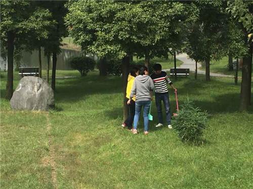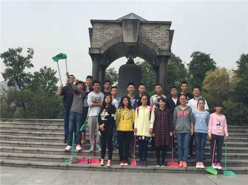 按照事前的安排,男生主要打扫钟亭外围,而女生则负责石阶和地板的清洁。天气凉爽,大家均耐心、认真地完成自己的工作,细心地扫起地上的烟头、纸屑等垃圾。带抹布的同学负责石柱的清洁。有些小组积极帮助其他同学收拾垃圾,热情高涨。时间虽然有些仓促,但同学们高效率地完成本次清洁工作,钟亭及其附近的草地没有了垃圾的踪影。之后进行了素质拓展活动。