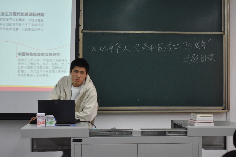 紧接着,曾丹老师带领大家从经济腾飞、社会进步、科技创新以及国际地位显著提升四个方面,全面回顾了中华人民共和国成立75周年来的奋斗历程。她指出,作为新时代的青年,应铭记使命,勇于担当,将个人的理想追求融入国家的发展大局之中,用青年的智慧和汗水为国家的发展添砖加瓦,贡献力量。
