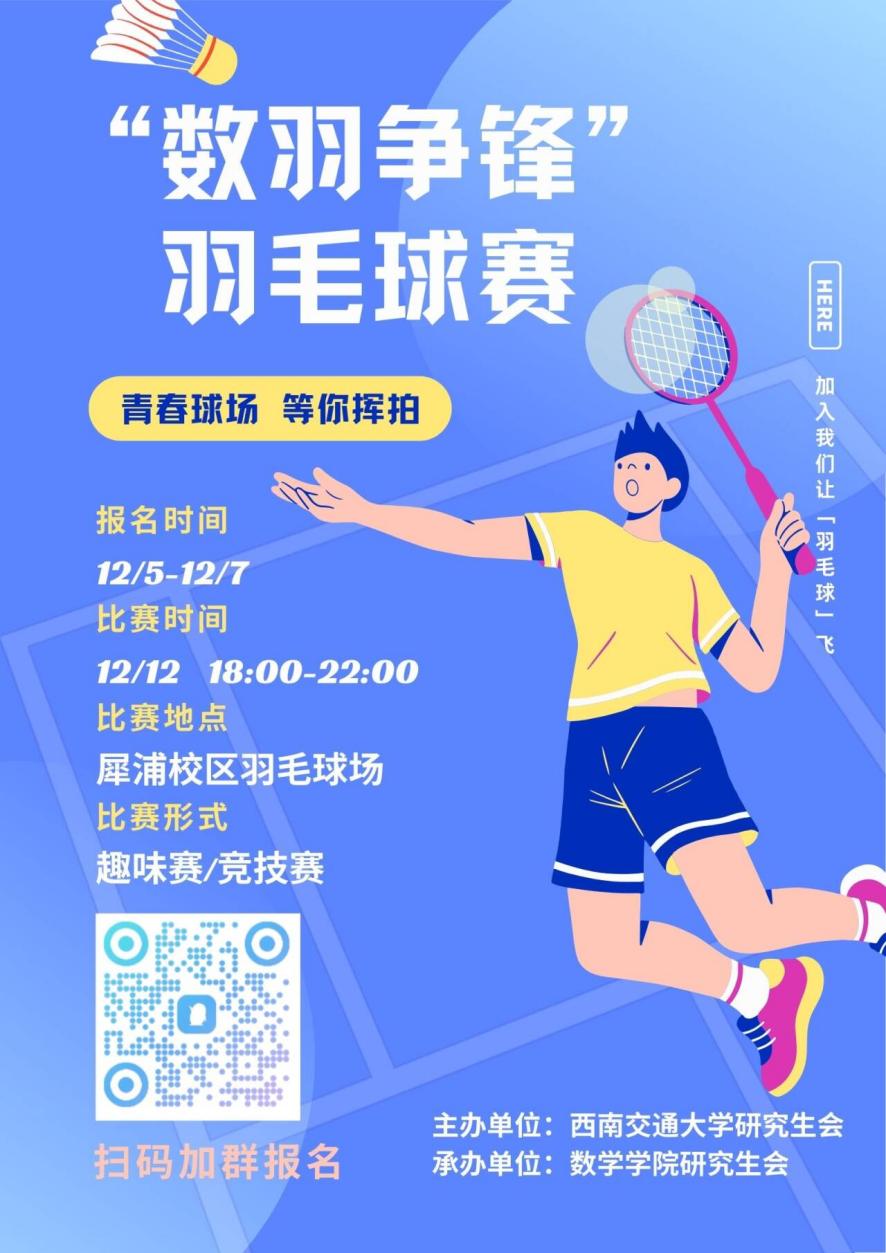 科研路上,我们以严谨铸根基;羽球场上,我们用活力展风采!无论你是技艺精湛的“羽林高手”,还是初窥门径的运动新手,都请别错过这场跨越年级的交流盛会。在这里,每一次挥拍都将成为友谊的见证,每一场对决都能收获成长的力量。放下书本,拿起球拍,让我们在阳光下尽情奔跑,用汗水浇灌情谊,用运动点燃青春!即刻报名,与全院师生共赴羽球之约,书写属于数学人的运动华章!