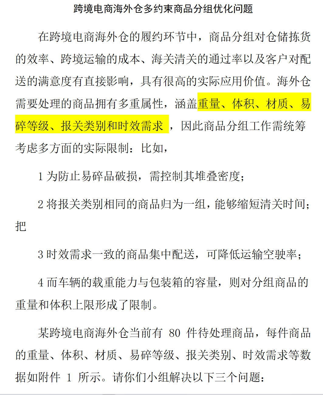 A题是一道跨境电商海外仓多约束商品分组优化问题。要求参赛者深入跨境电商的物流仓储场景,核心任务是在商品重量、体积、材质、易碎等级、报关类别与时效需求等多重属性交织的复杂约束条件下,建立多目标优化模型以实现商品的最优分组。该题特色在于问题层层递进,从基础仓储约束逐步扩展到涵盖运输与清关的全流程合规要求,极其考验模型在多重限制下的组合优化与统筹规划能力,适合擅长构建混合整数规划或设计高效启发式算法的队伍。