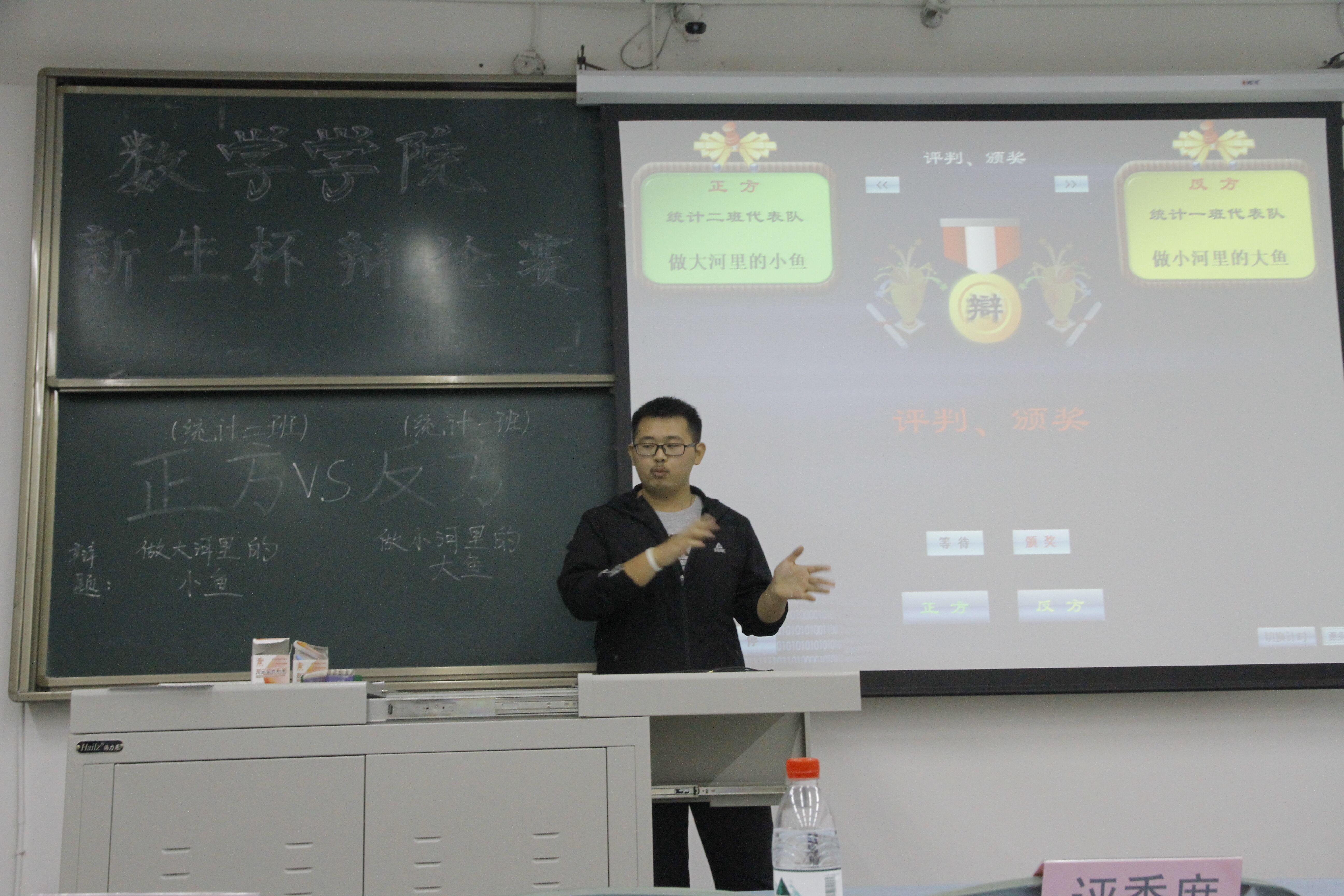 统计一班代表队与统计二班代表队以“做大河里的小鱼还是做小河里的大鱼”为题展开辩论。统二代表队持正方观点,认为做大河里的小鱼能开拓视野、扩展人脉、获取更好的资源以促进自己的成长。统一代表队持反方观点,认为在小河里的大鱼能处于领先地位,使得自己不被压抑而不断前进,认为小舞台照样有大精彩。