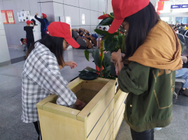 清洁组的成员们一直忙碌在客运站大厅的各个角落。花架旁,空调边,玻璃的倒映里,都可以看到他们的身影。这些同学们的劳动为乘客们提供了一个干净整洁的候车环境。