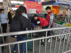 下午1时,青协的小伙伴在学校西门集合,一起前往茶店子客运站。半小时后,头戴小红帽,身着红马甲的小伙伴明确了分组分工,分布在人潮涌动的客运站的各个地方。