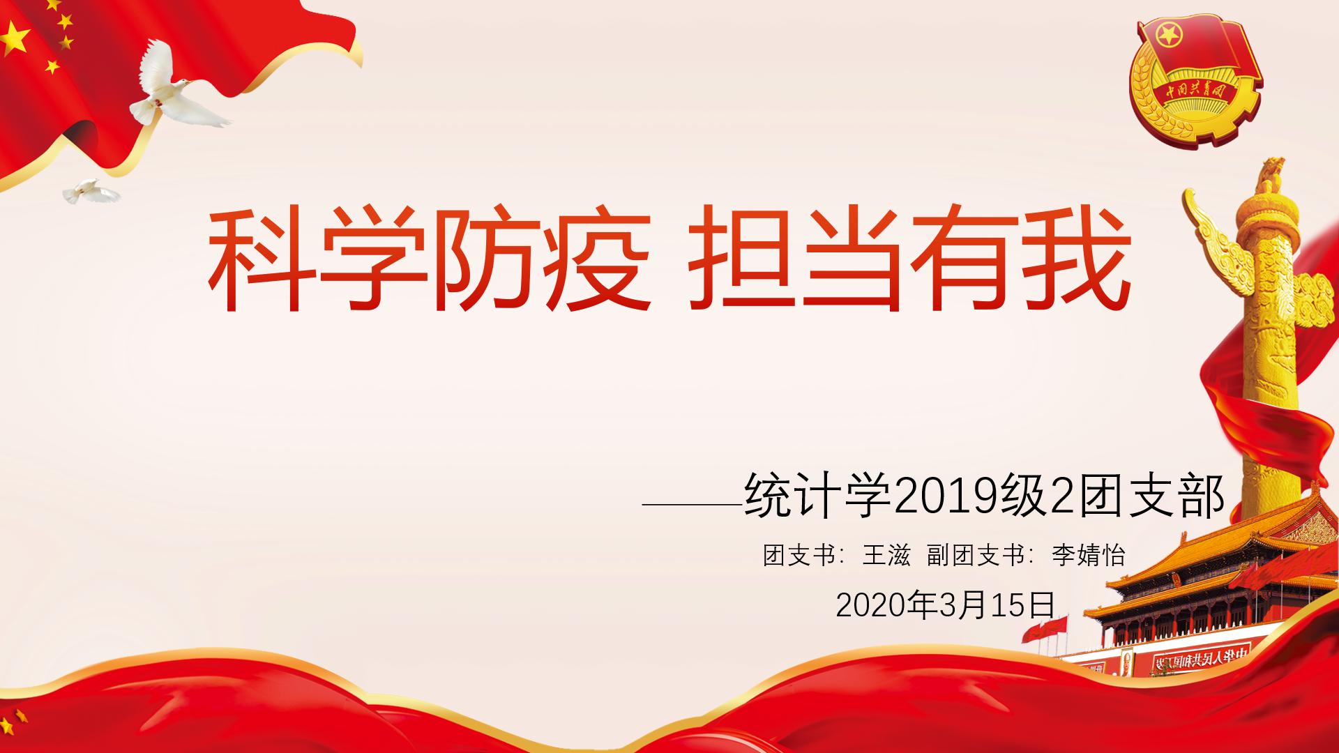 统计学2019级2班团支部的2020年春季第一堂团课以视频会议的形式于3月15日19:30开展。团课以“科学防疫担当有我”为主题,号召支部团员们共同打赢防疫阻击战。