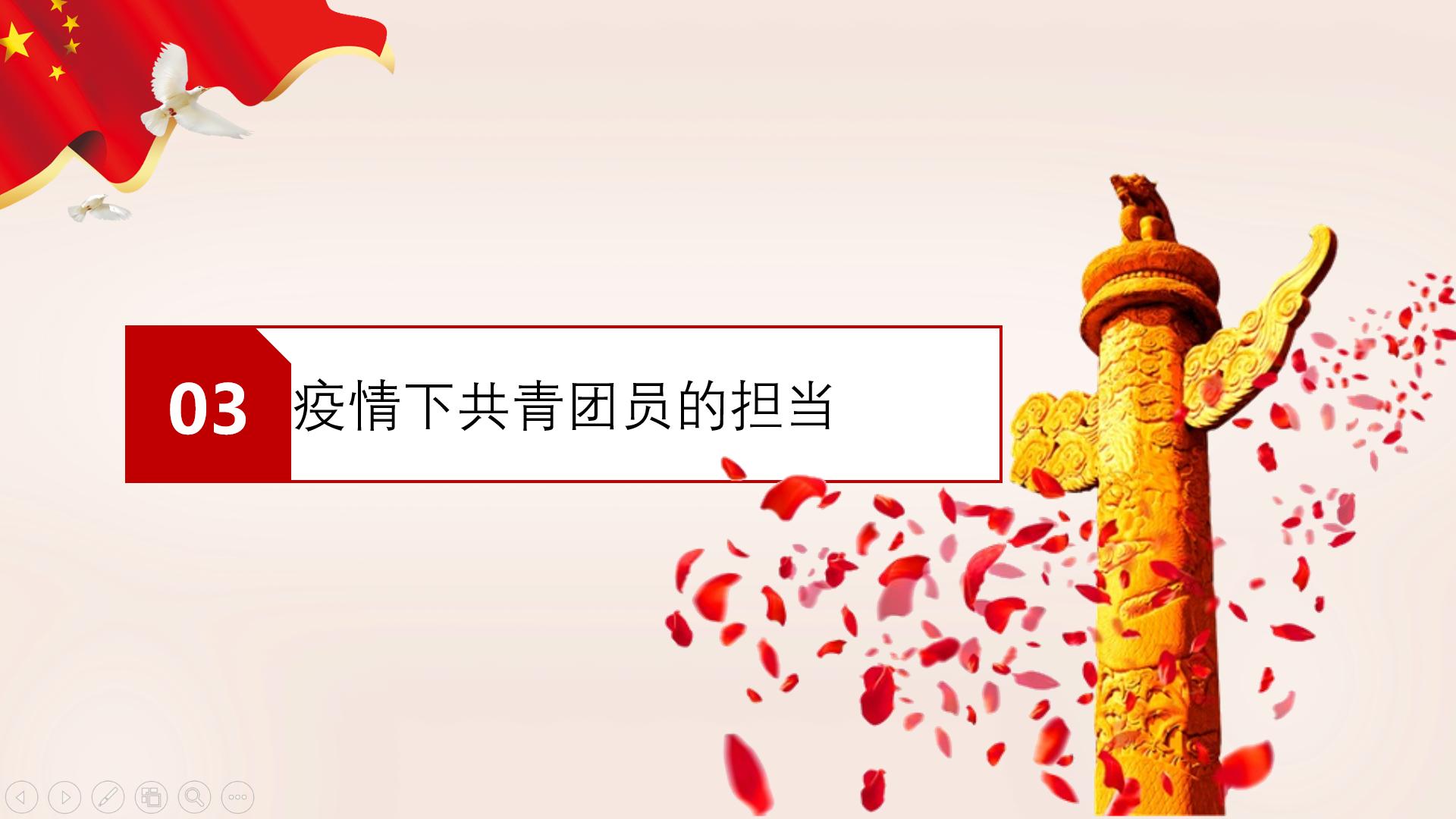随后是团课的第三个部分——疫情下共青团员的担当。团支书首先讲解了优秀共青团员在城乡社区、医疗救护、交通运输等领域所做出的努力以及一些行之有效的防疫措施。她呼吁我们要听从党的指挥、响应团的动员,学习优秀共青团员的思想精神,积极投身到新冠肺炎疫情阻击战当中来,为疫情的斗争贡献力量。