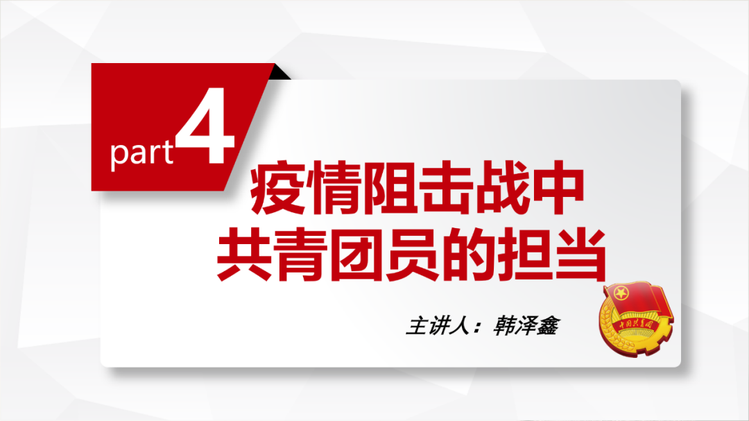 接下来,班长韩泽鑫为团员们讲述了疫情阻击战中共青团员的担当。在深受有志青年们的感人事迹鼓舞的同时,团员们也深刻意识到了自己肩上作为生力军和突击队的责任与使命。