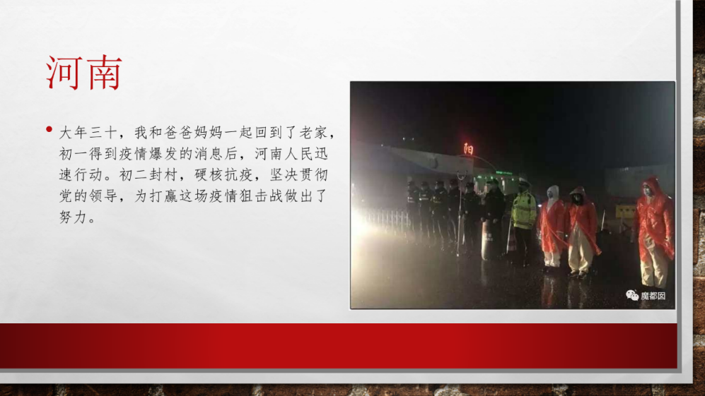通过此次团日活动,我看到了支部团员青年们浓烈的爱国情感,以及他们抗击疫情的坚定信心。每个团员用自己的方式表达着他们的情愫。本次团日活动虽然在线上开展,团员热情却丝毫不减,每个人都收获颇丰。近期以来,我国疫情已基本得到控制,充分体现了我国的抗疫决心、制度优势。最后祝愿我们的祖国尽快走出疫情阴霾,早日取得疫情阻击战的伟大胜利。