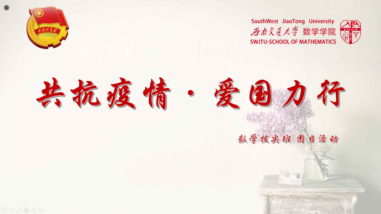 应用数学2019级拔尖班团支部于4月28日下午两点半通过腾讯会议开展了以“共抗疫情·爱国力行”为主题的线上团日活动。本次团日活动由团支书宫天浩主持,支部全体团员参与。