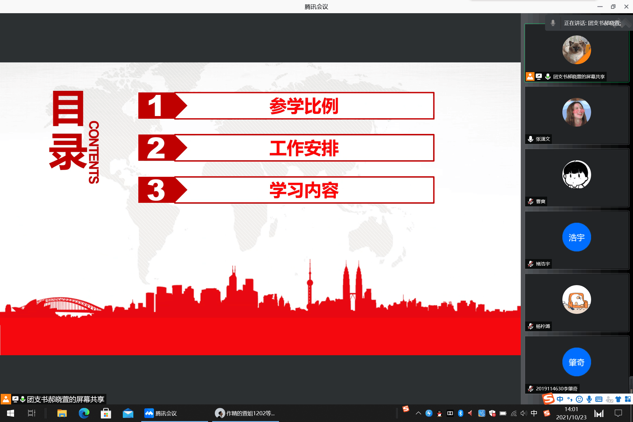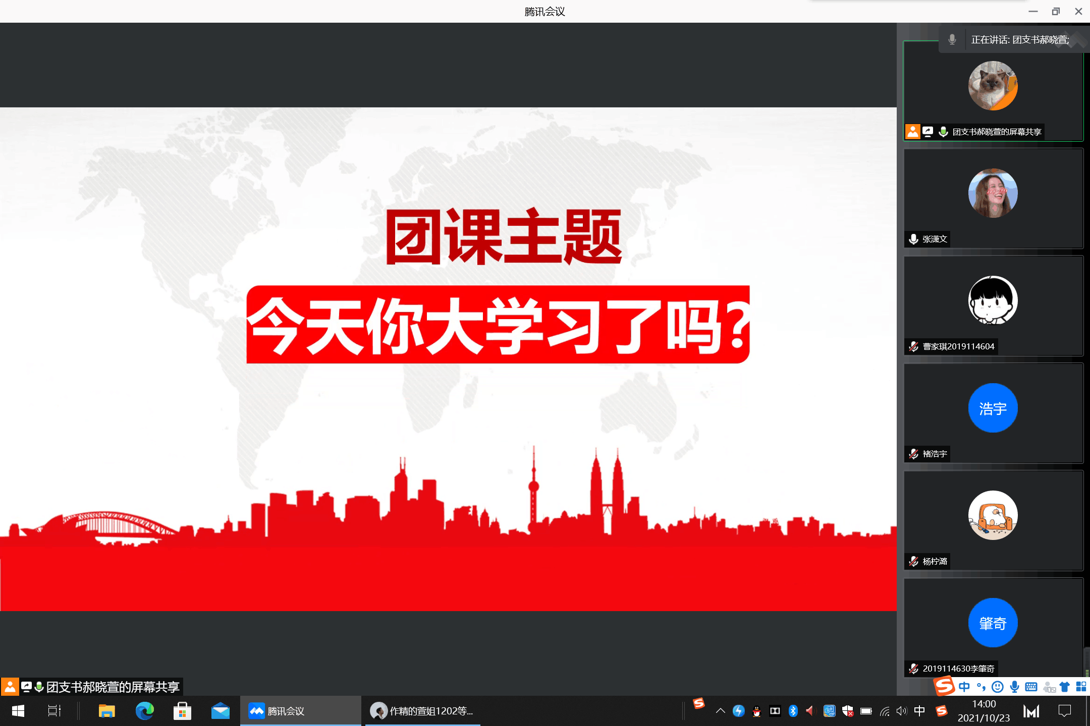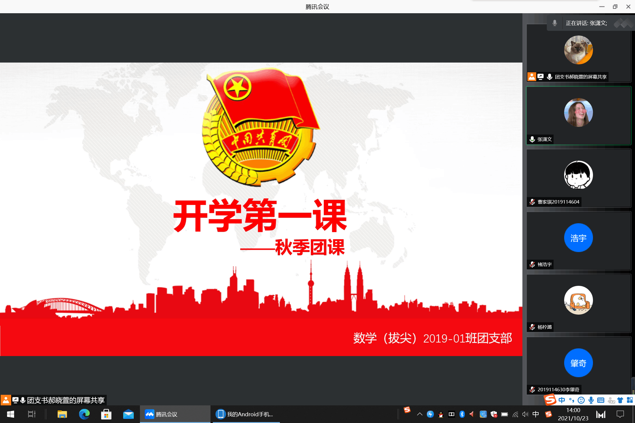 2021年10月23日下午2时,网飞猫 数学(拔尖)2019-01班团支部秋季第一堂团课在线上顺利开展。本次团课应到团员10人,实到9人,其中一人因事缺席。由团支书郝晓萱主持召开。