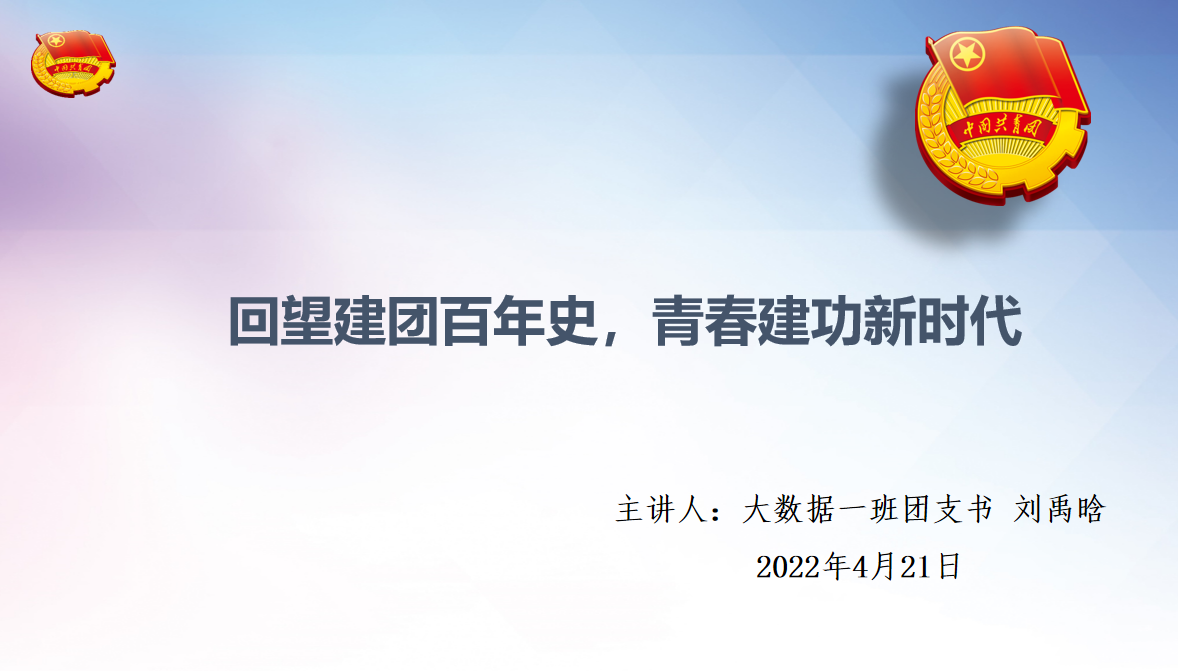 为组织学习中国青年运动的光辉历程、中国共青团成立百年来涌现出的先锋楷模、共青团在党的领导下团结带领一代代青年跟党奋斗的职责使命等内容,引导青年深刻领会习近平总书记对青年学生成长成才重要思想,进一步号召新时代青年坚定听党话、跟党走的信念和决心。2020级大数据一班响应学院团委积极开展春季第一堂团课的号召,于4月21日下午15:50在X2222教室举办了春季开学第一次团课。团课以“回望建党百年史,青春建功新时代”为主题,号召支部团员青年认真学习习近平总书记在党史学习教育总结大会上的重要讲话精神。团课由团支部书记刘禹晗主持,支部33名团员按时参加,认真学习。