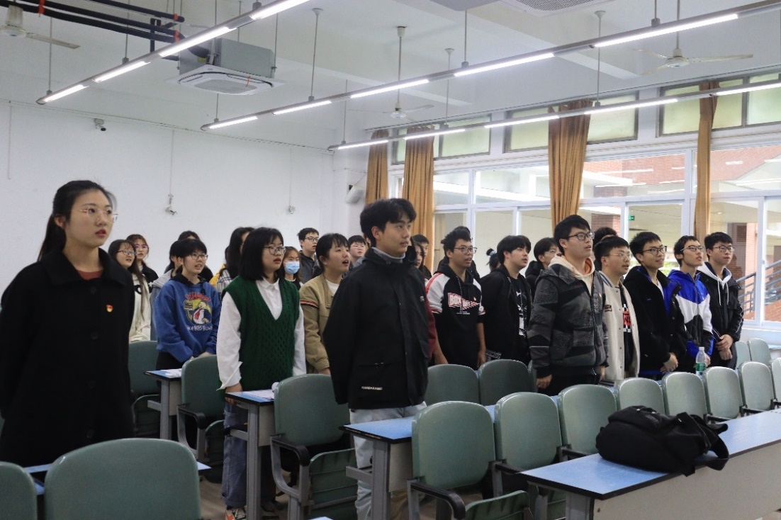 团课第一项议程,奏唱团歌。全体起立,团支书莫楚滨带领全班同学重温团歌,团课由此拉开序幕。