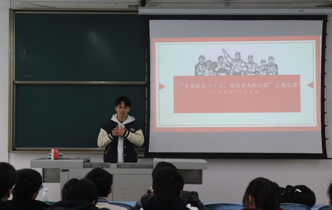 为迎接党的二十大胜利召开,庆祝中国共青团成立100周年,团结引领广大青年坚定跟党走、建功新时代,激发交大学子爱国荣校热情,2022年4月16日16时,2021级统计2班团支部于X2226开展了“青春献礼二十大,强国有我新征程”春季第一堂团课。