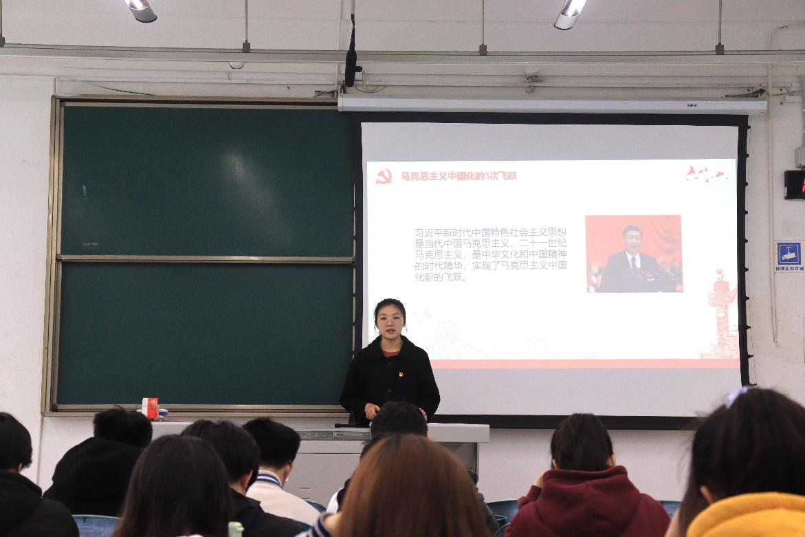 青年讲师团成员郑艺梅深入浅出地为同学们讲解了十九届六中全会所审议通过的《中共中央关于党的百年奋斗重大成就和历史经验的决议》。内容涵盖马克思主义中国化的三次飞跃、百年奋斗的五大历史意义等。同学们在台下聚精会神,没有丝毫懈怠。通过理论的学习,同学们更加明确自我肩负的职责,提高了政治觉悟和理论修养,大有裨益。