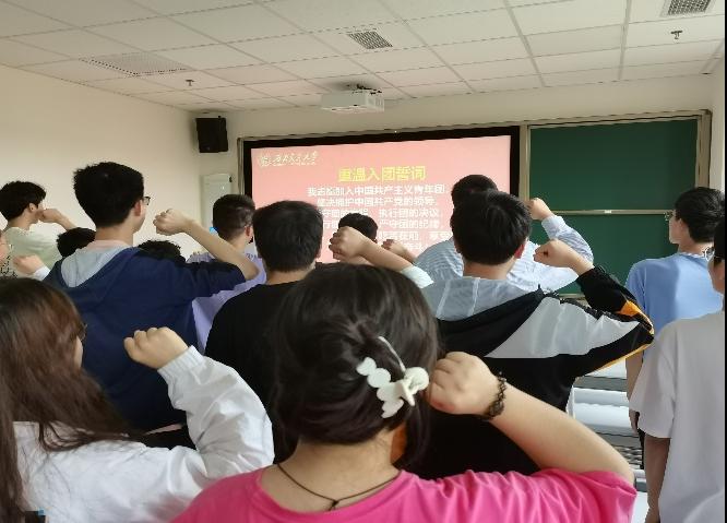 团课活动第四项,全体起立,重温入团誓词。支部全体成员,举起右拳,在团支书的领誓下,洪亮地重温入团誓词。重温入团誓词也提醒着支部成员不忘初心,继续砥砺前行。