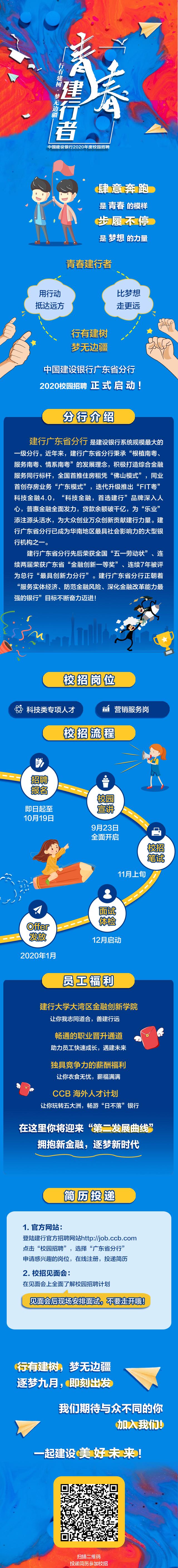 非常诚挚地邀请贵校理工科相关专业2020年毕业的本科生和研究生加入广东建行大家庭,我们今年计划招聘具有计算机、软件、数学、通信、自动化、电子商务等相关专业背景的毕业生加入到应用开发、大数据中心、运行中心、网络金融等科技专项人才队伍中,简历接收截止时间为10月19日,请有兴趣的同学登录【//job.ccb.com/】进入【校园招聘】选择【广东建行】投递简历,可同时关注我们的招聘公众号【中国建设银行人才招聘】了解最新招聘动态。