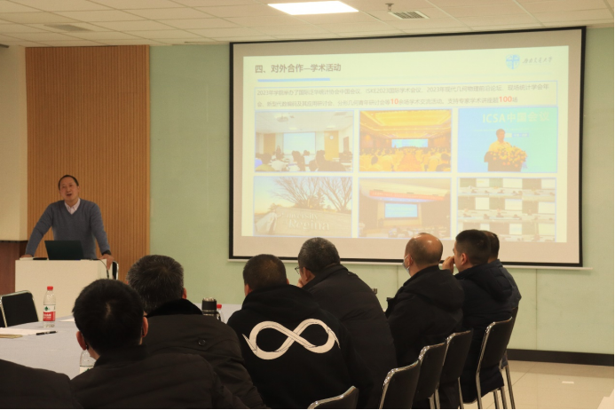 的三个专业都已达到国家一流建设水平,并在2023年共建教育部署数学系列课程虚拟教研室,教师教学和学生学科竞赛取得了重大突破,人才培养成效显著;今年共获批国家自然科学基金重点项目1项、面上项目4项和青年基金2项,科学研究硕果累累;2023年学院举办了10余场大型学术交流活动,学术活动颇有成效;成功举办了第十四届数学文化节,并深入开展社会实践和班风学风建设,学生工作方兴未艾。最后,杨院长介绍了2024年工作要点,为学院的未来发展锚定了新目标。