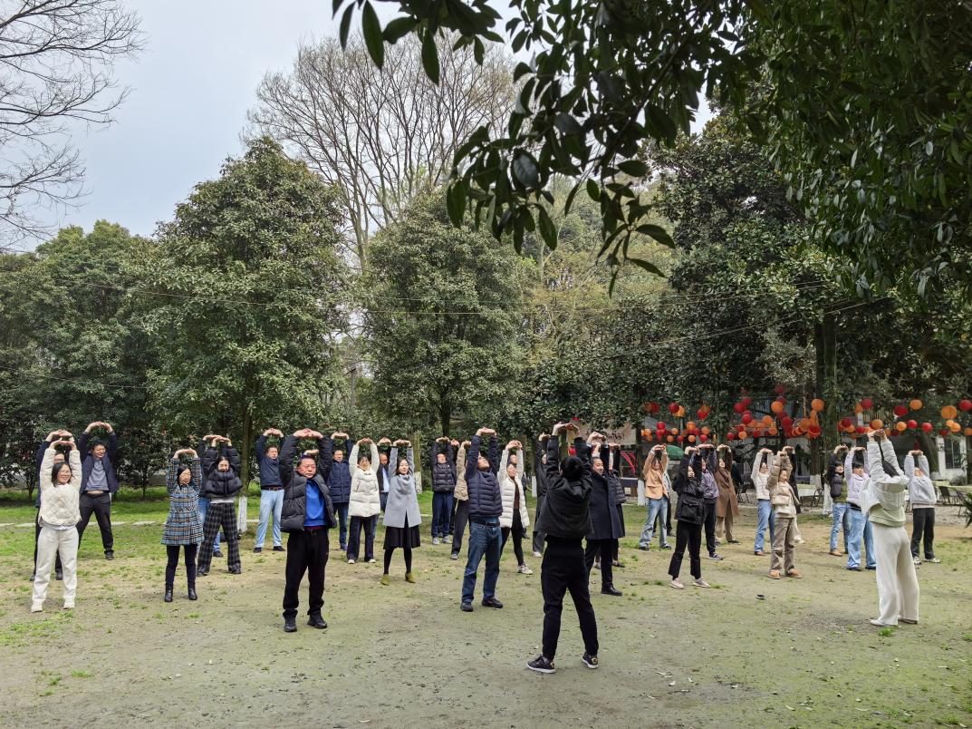 活动伊始,在卢鹏老师和韩玫老师的带领下,教职工们整齐排列,开启了一段美妙的八段锦的学习之旅。老师们一招一式认真模仿,在舒缓的节奏中舒展身体,感受着传统文化带来的独特魅力。现场氛围轻松愉悦,大家相互交流动作要领,强身健体、增进情谊,在动静之间感受生命真谛,在欢声笑语中感悟幸福人生。