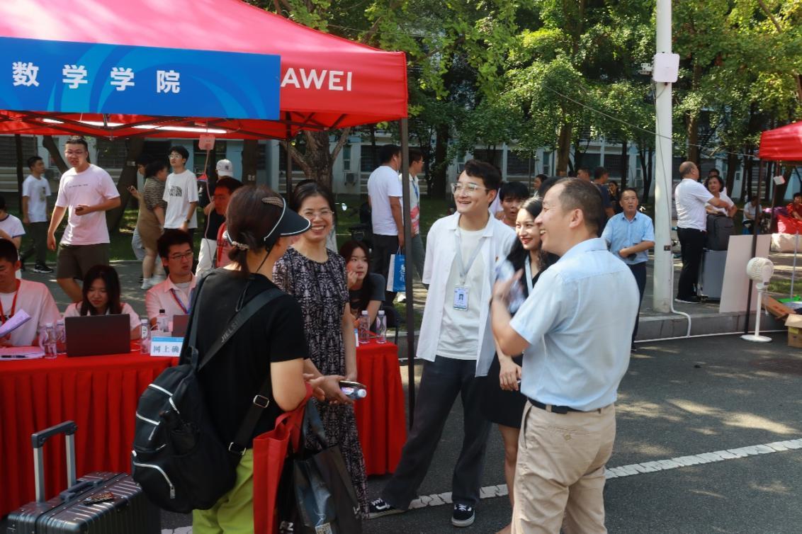 2023级本科生新生辅导员张素子、研究生新生辅导员黄玺文带领着志愿者们早早来到迎新点完成各项准备工作,一切都有条不紊地进行,静候新生们到来。