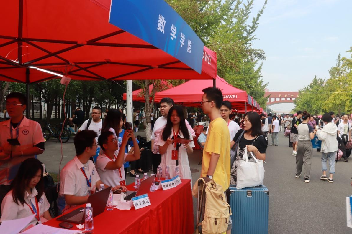 上午8时,第一批新生来到迎新点报道。在志愿者们引导下,新生们有序排队、信息校核、网上确认、领取物资,之后乘坐摆渡车前往宿舍。