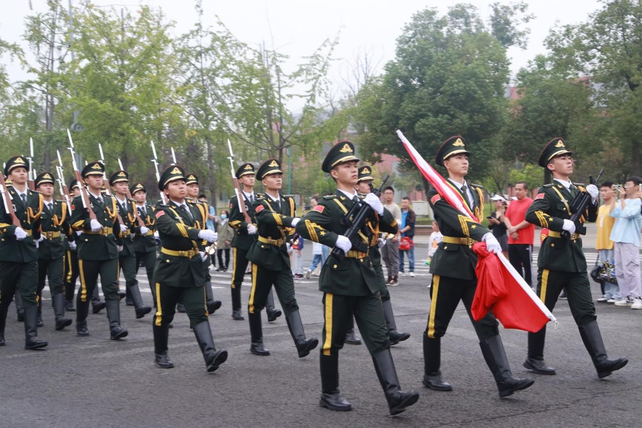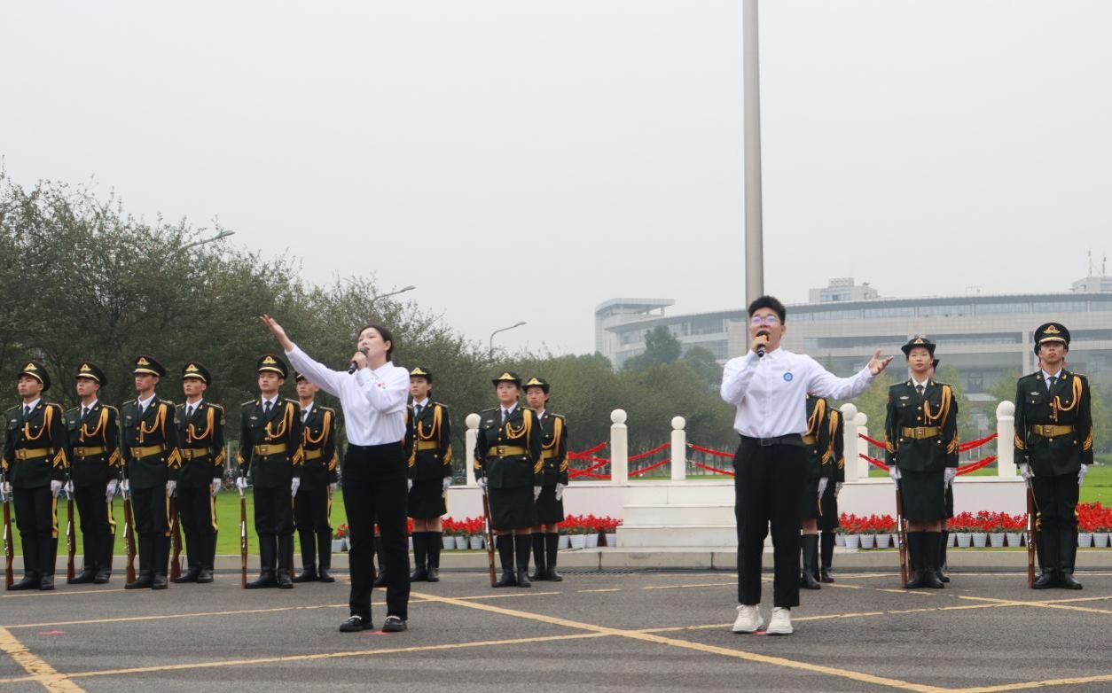 国旗护卫队迈着整齐的步伐将五星红旗护送至升旗台,全场师生肃穆站立,行注目礼,国旗在《义勇军进行曲》旋律中缓缓上升。全场师生合唱《我爱你中国》《我和我的祖国》,用歌声为祖国生日送上祝福。