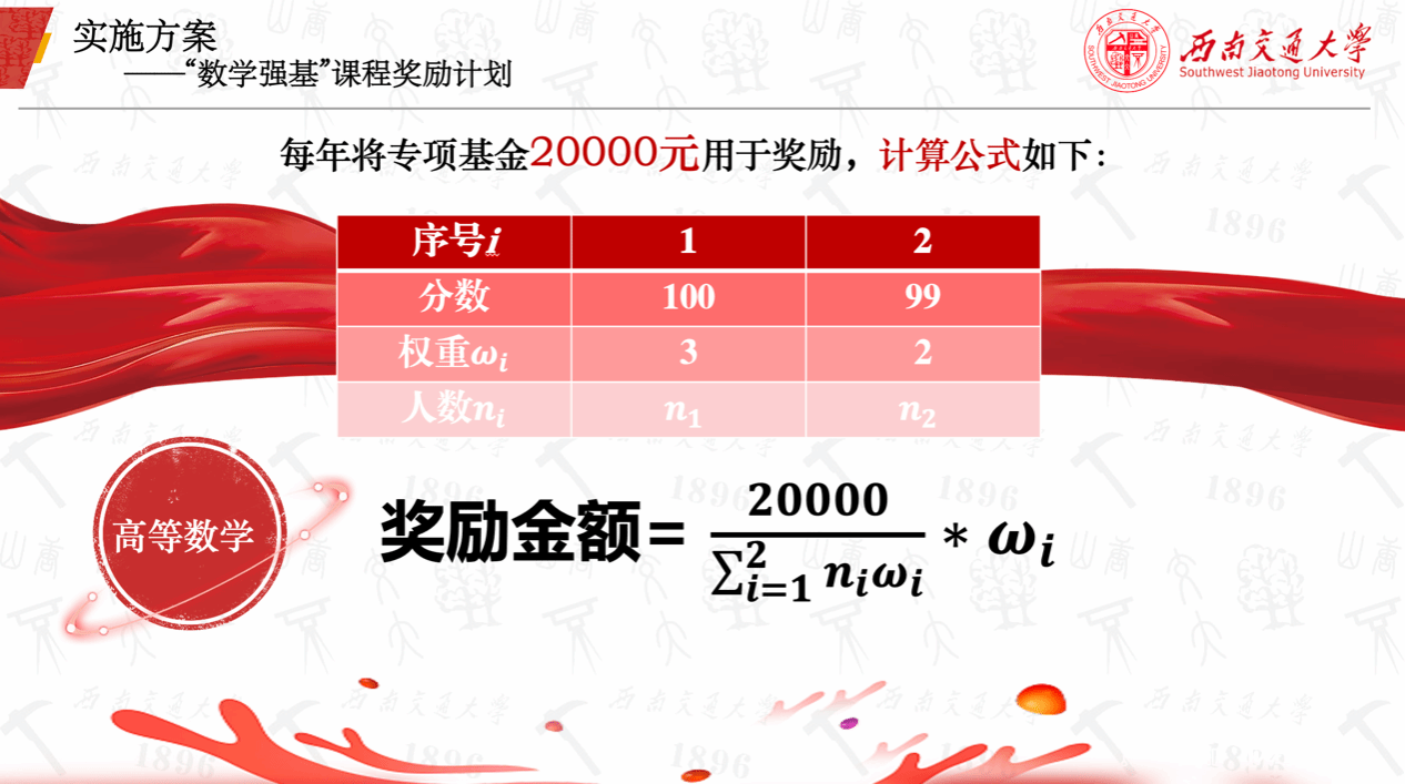 在深化学业指导“X+1”帮扶机制、加强常态化学风建设、促进职业生涯规划“筑梦引领”行动、完善“交通+数学”知识交叉融合方案做出了一系列探索和实践,本次发布的“数学强基”课程奖励计划针对数学公共课程高等数学设立2万元专项奖励基金,对在高等数学课程期末综合测评成绩为100分、99分的同学给予一次性奖励,希望通过奖励计划的实施进一步提升数学素养、贡献数学担当、为新时代人才培养做出新的更大的贡献!