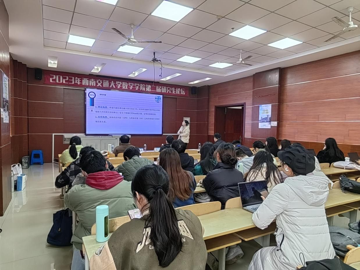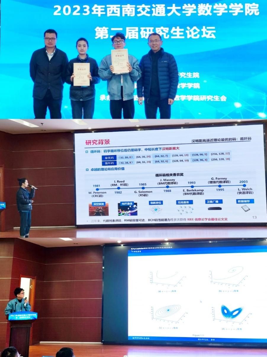 随后,21级博士研究生徐丽、蒲哲分别开展了题为“循环码的微分码及其微分译码算法”、“随机p-Laplacian抛物方程的动力学行为及其数值逼近”的专题报告。徐丽主要介绍一种基于循环码的代数表示而构建的,适于概率信息传递的分解-重构结构,并给出相应的循环码概率译码机制。蒲哲主要介绍了无界薄域上的随机 p-Laplacian方程的动力学行为,严格证明了随机吸引子的存在性,并且得到了吸引子的上半连续性。这两位优秀博士研究生的报告不仅展示了他们在各自领域中的深入研究,也为与会者呈现了数学研究的魅力和潜力。