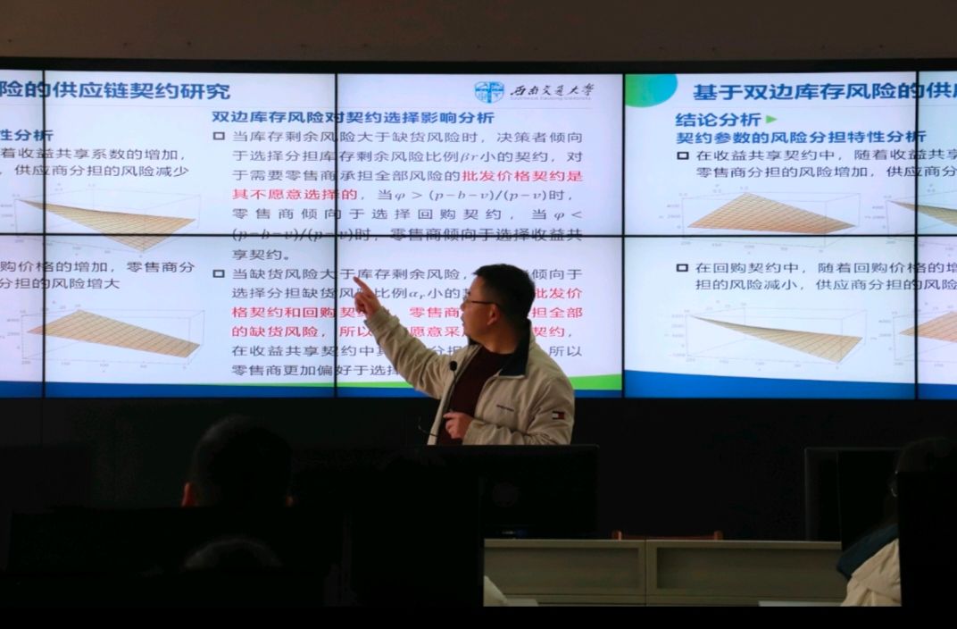 在交通运输与物流学院,蹇明教授为同学们讲解了基于双边库存风险的供应链契约研究,他通过成都实际烟草调度配置问题,让同学们感受到大数据在未来研究中的价值,并且切身体会到了数学在其中的重要性。
