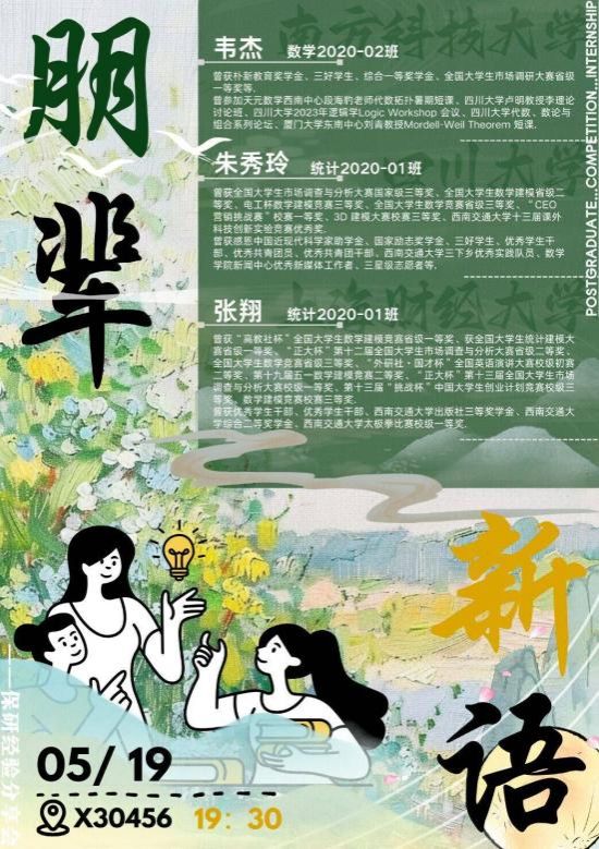 5月19日晚7时30分,“朋辈新语”保研经验交流活动在X30456顺利开展。此次活动邀请了20级数学与应用数学专业的韦杰,以及统计学专业的朱秀玲和张翔三位同学,旨在为有志于保研的同学们提供指导。张翔以简历制作为切入点,深入剖析了竞赛、专业课和保研课程的学习方法,详细解读了获得保研资格的关键条件,并分享了科学的简历投递策略。此外,他还指导同学们如何准备夏令营和预推免考核。韦杰通过数据分析,直观展示了2024年数学学科及应用数学普通班和拔尖班的保研、考研及境外升学情况,为同学们在升学路径选择上提供了有力的数据支持。他还提到,注重学习方法和有效交流对于避免内耗、明确读书目的至关重要。活动尾声,韦杰结合自身经历,与同学们互动,详细解答了保研过程中遇到的各类问题,帮助他们做好心理准备。