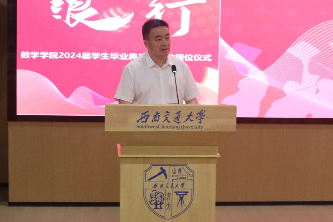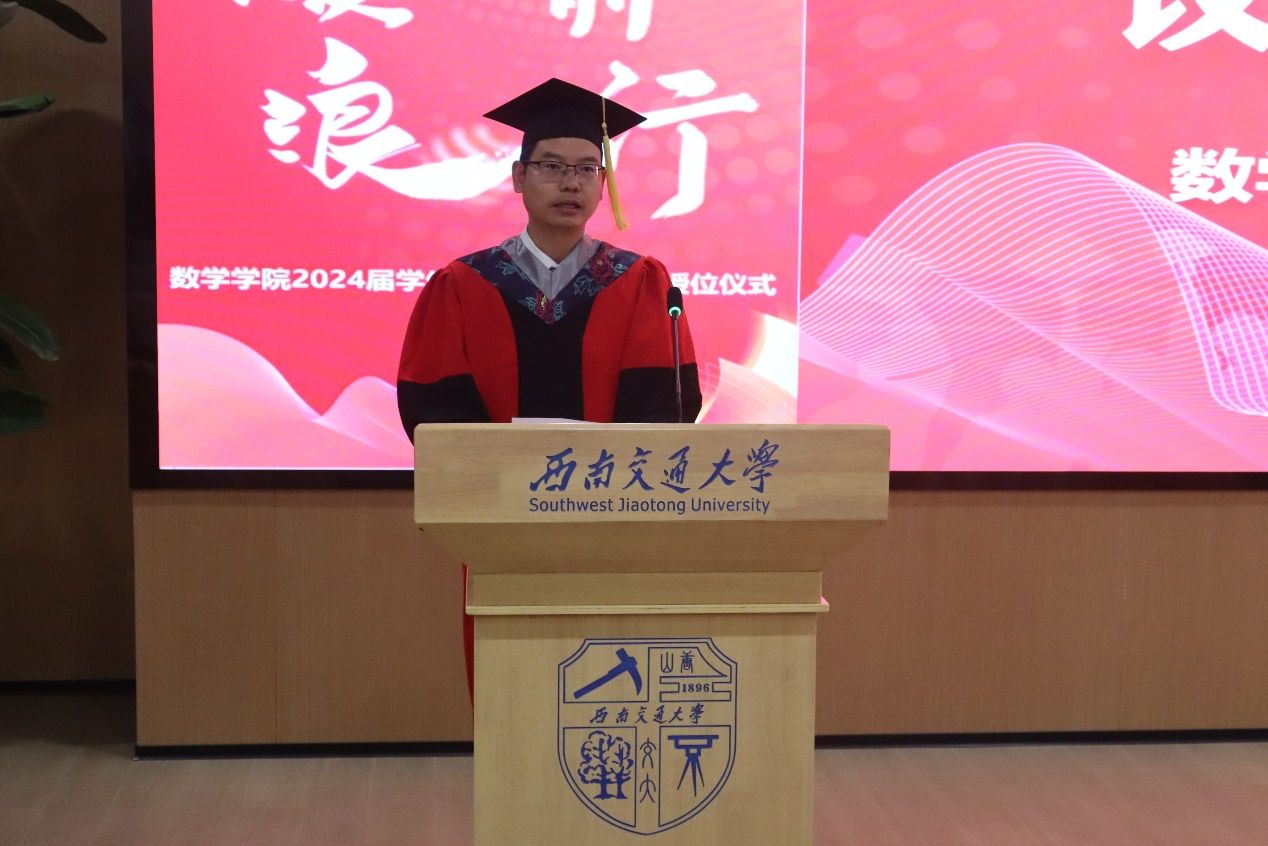 典礼第一项,院长杨晗教授致辞。杨晗院先向2024届全体毕业生致以热烈的祝贺,对教职工、家长亲友的辛勤付出表示诚挚的感谢。离别之际,杨晗院长对毕业生寄予四点厚望,一为:做一个对得起国家、社会和自己的人。要志存高远、勤奋笃行、不断进取、追求卓越,成为“为学、为事、为人”的典范。二为:做一个热爱学习、保持奔跑的人。信息时代是数学人大有作为的时代,要始终保持一种学习的状态,锻炼改造自我、改造社会的能力,自信从容地面对未来的挑战。三为:做一个独立思考、温暖纯良的人。保持独立思考的能力,经历人生的磨砺后依旧怀抱善良和热爱,与世界共同成长。四为:做一个赶路并欣赏风景的人。尽管未来充满未知与挑战,也要保持平常心,享受旅途的每一个瞬间。最后,杨晗院长再次祝愿2024届毕业生们“所见皆美好,所行皆坦途,所爱皆可得,所想皆如愿”。