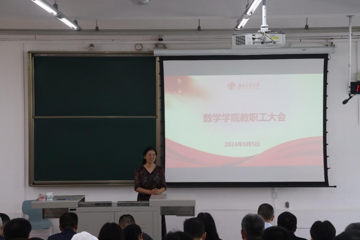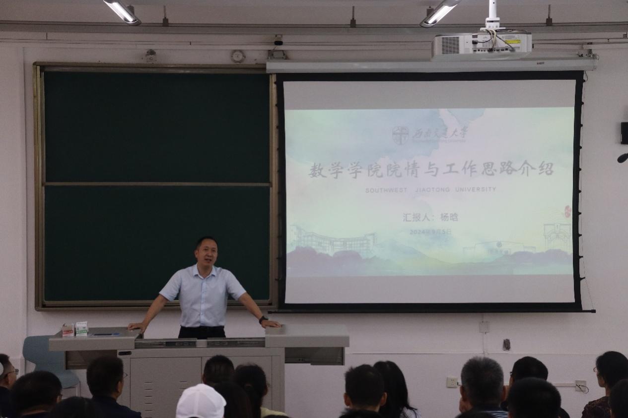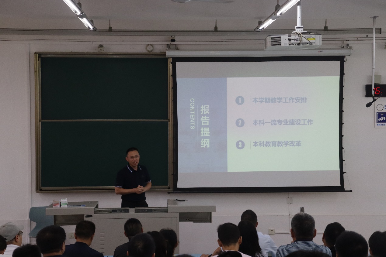 院情及本学期重点工作进行介绍。杨晗院长指出,目前我院人才培养体系完善,科研平台基本具备,但在发展过程中也面临着诸多问题,例如师资力量结构略有不均,学院建设大而不强,对外合作交流的情况不甚理想等,仍需要加强高层次人才的培养引进。杨晗院长呼吁教师全身心投入教育教学工作,将教育教学与科研工作并重,锚定国家战略与科研需要,鼓励教师参与教材编写,提高科研项目供给的质量,改革绩效分配,在教学与科研领域做好数学赋能。