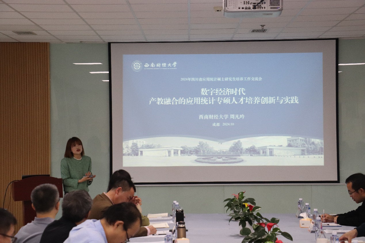 会议第二项,嘉宾就研究生培养工作进行交流。首先发言的是西南财经大学统计学院应用统计硕士教育中心执行主任周凡吟教授。周教授从学院学科体系与应用统计专业概况出发,针对在数字经济时代背景下的人才培养关键问题,提出了产教融合的应用统计专硕人才培养创新与实践方案。