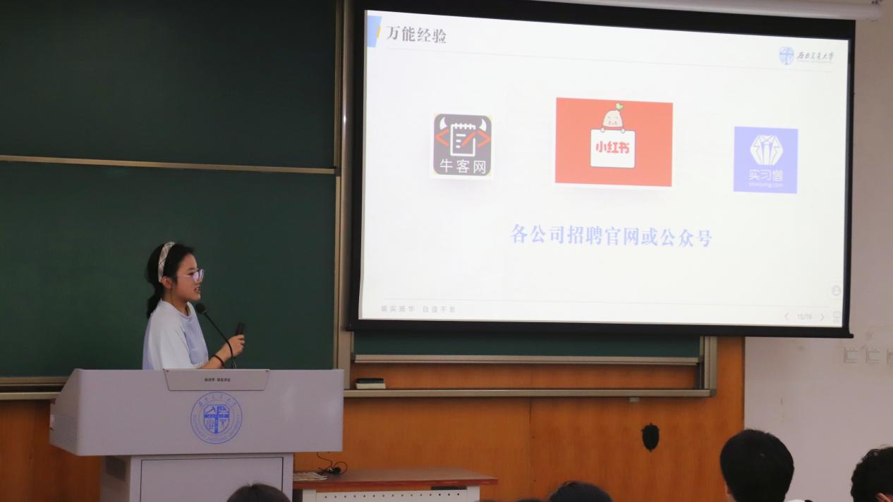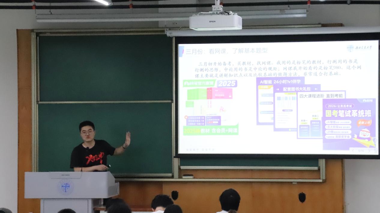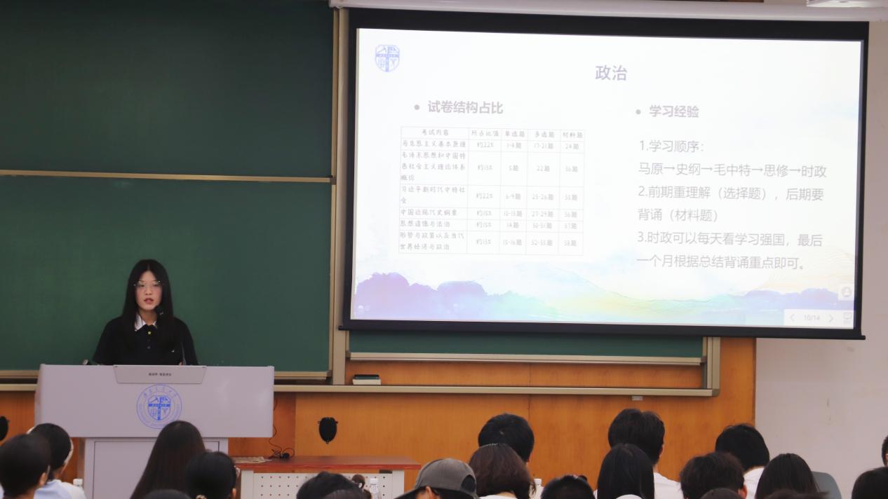 在就业方面,许贤贤分享了成功入职华为的经历,并通过面试复盘分享面试技巧,希望同学们树立信心,敢于尝试。刘浩介绍了自身的求职思考与就业经历,建议同学们清晰个人定位,不断提升自我。张哲通过数据对比分析当前公务员考试现状,并就公务员备考的学习方法与网络资源进行分享。
