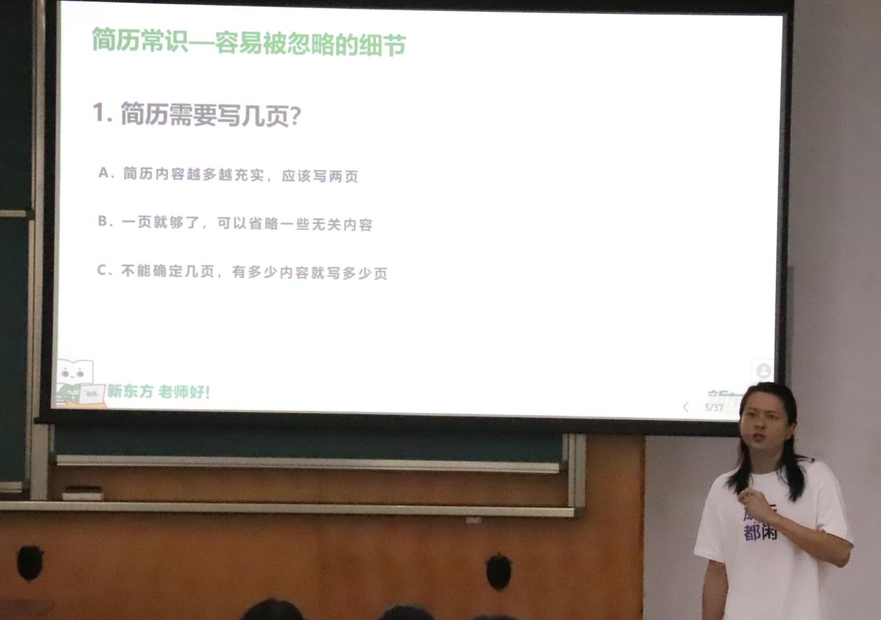 活动特邀新东方教育科技集团成都学校人力资源部高级经理苏宇杰担任嘉宾,以“个人简历制作”为主题展开分享。苏宇杰结合数字化招聘趋势,深入剖析简历优化策略,强调岗位匹配的重要性,并通过行业案例解析差异化筛选标准,指导学生如何通过量化成果提升简历竞争力。