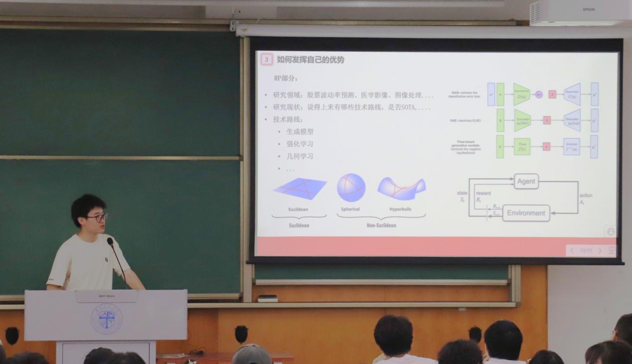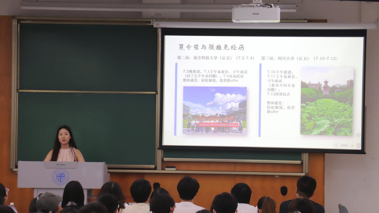在升学方面,胡丽君从保研规划制定、保研流程解析和保研准备要点三方面展开讲解,围绕自身参营经历分享经验。赵明钰详细介绍了考研流程,在考研规划及资料选择方面提出建议。夏瑜崚从保研和留学的选择切入,系统介绍留学所需做的准备,并针对性地给出各学期的规划建议。马万里从自身科研经历出发,分享了自身从数学专业转向计算机专业的心路历程,鼓励同学们明确目标,靶向突破。