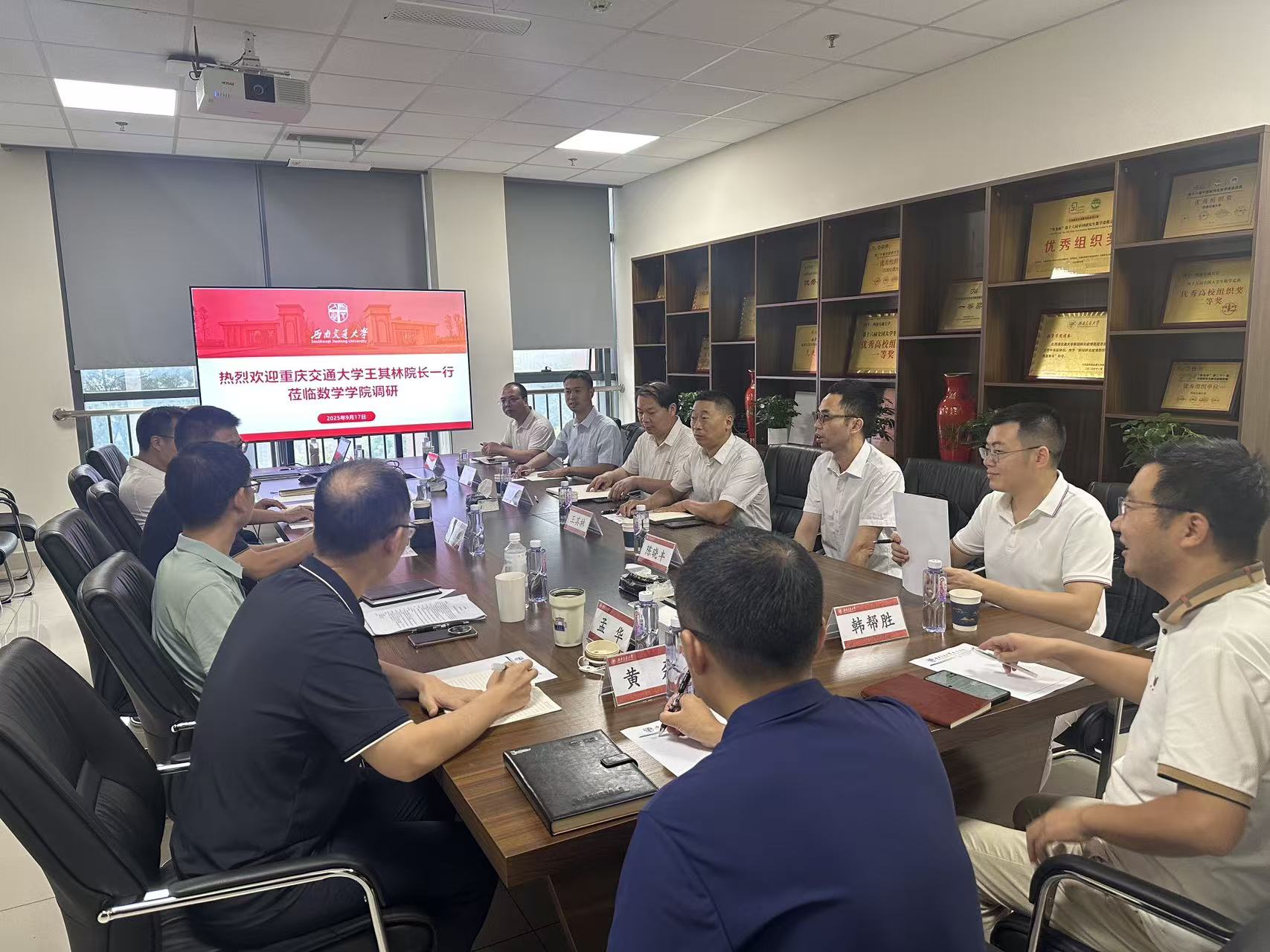 2025年9月17日上午,重庆交通大学数学与统计学院王其林院长一行到学院调研交流。学院党委书记李志辉,党委副书记黄祥,副院长黎定仕、杨洋,系主任黄磊、孟华,韩帮胜,综合事务办公室主任郝虹参加会议。