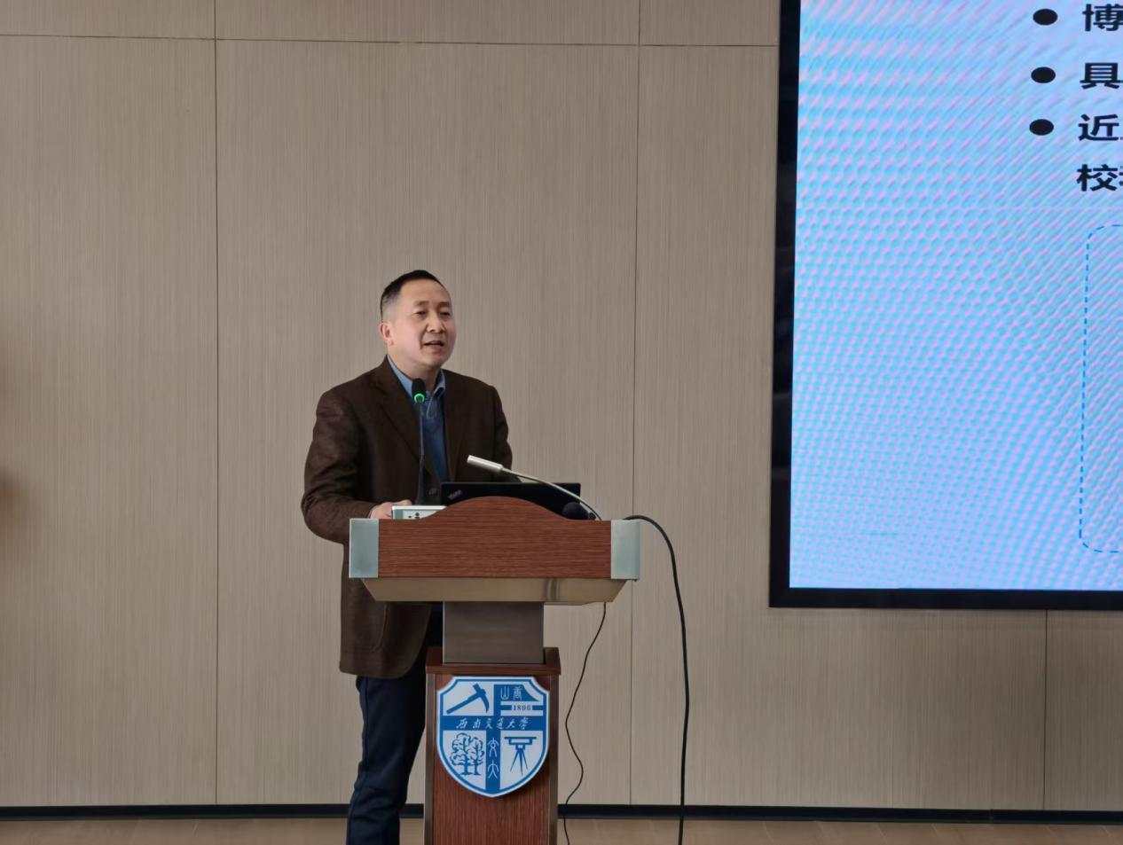杨晗代表学院领导班子作年度工作述职报告,聚焦学院内涵式高质量发展,围绕学科建设提质、人才培养创优、师资队伍强化、科学研究突破、国际合作拓展及“十五五”规划目标与举措谋划等重点内容进行系统汇报,同时完成个人述职。