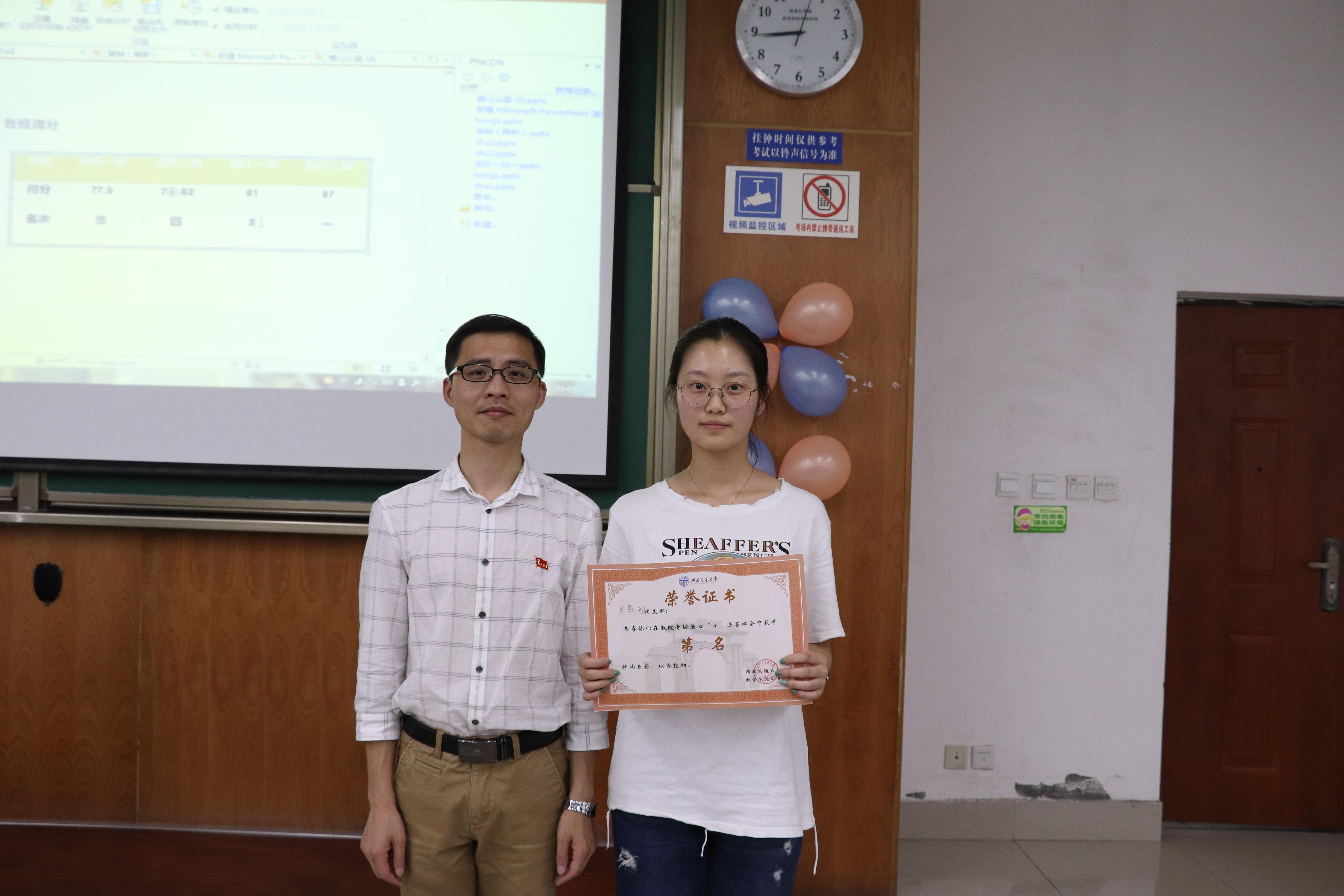 在一段展示四个班志愿活动结果的视频之后,主持人宣布:统计二班获得最高得分。接着,党委杨育鸿副书记为四个班级颁发了奖状并与同学们合影留念。