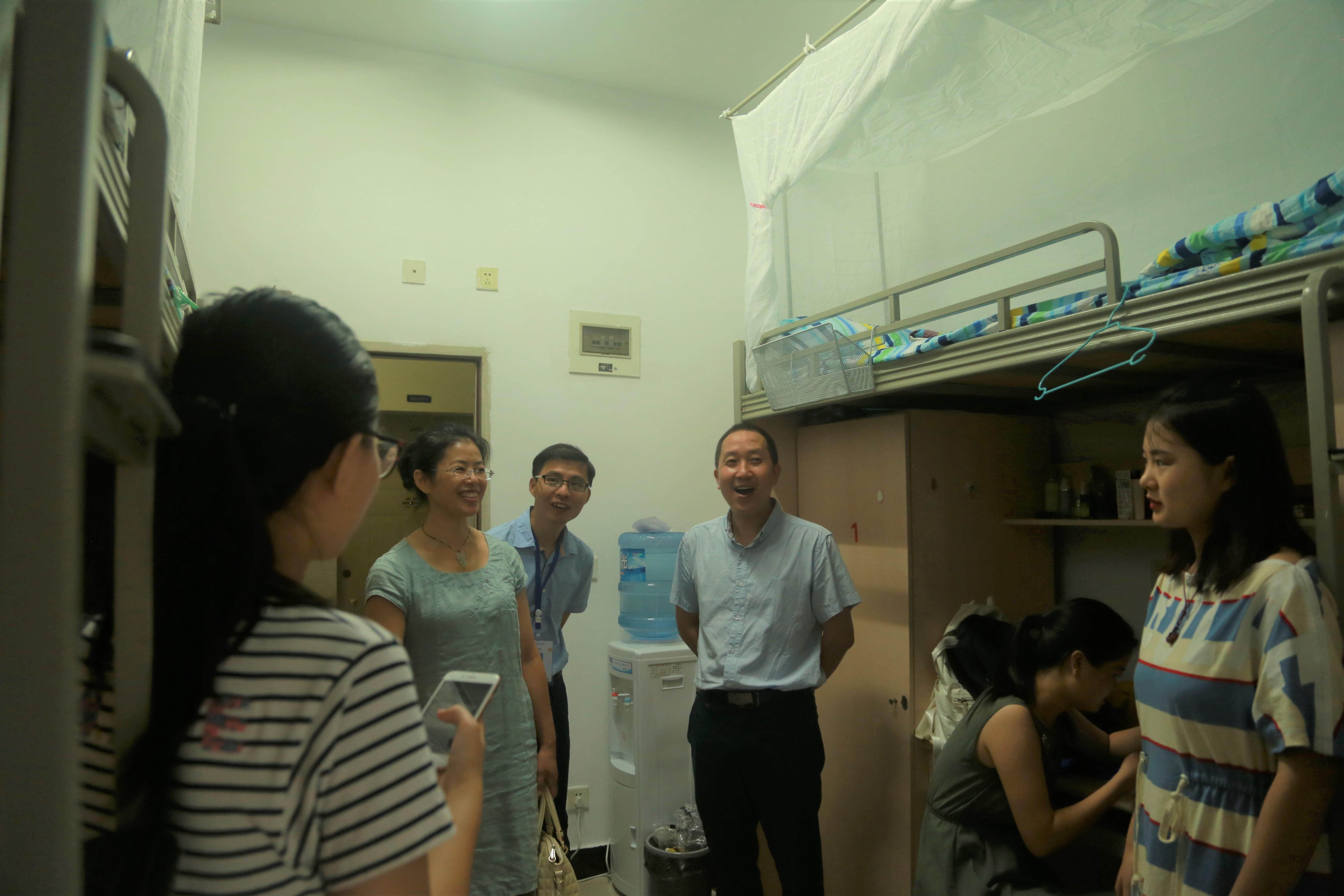 新生所在的寝室,看望刚刚入住的同学们。徐书记和杨院长重点关注了寝室环境安全与卫生的保障,希望让新同学们能够住在一个舒适的环境中。新同学们对于领导的亲切关怀也表示了感激。