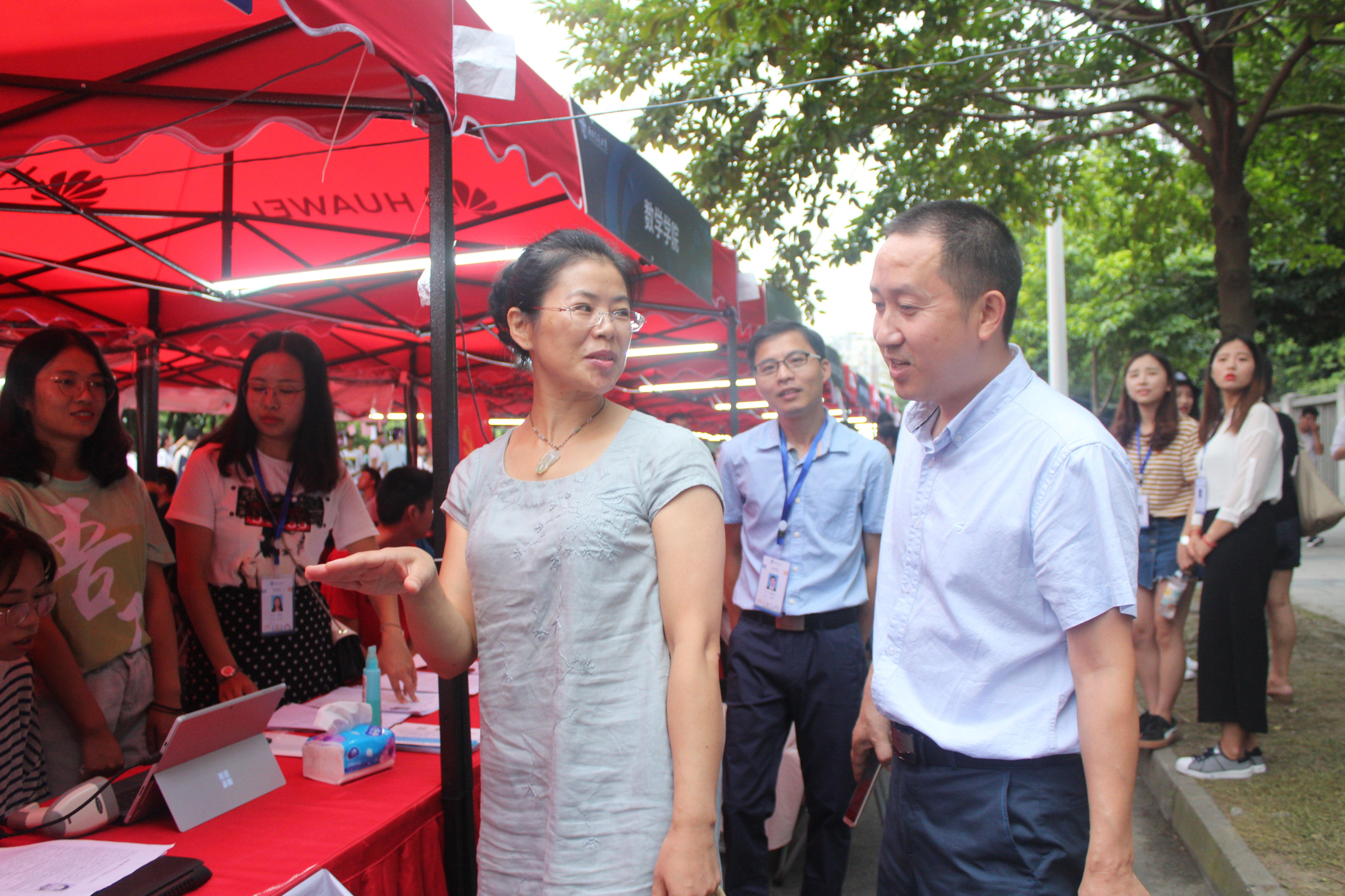 的迎新点,视察迎新工作开展并慰问迎新志愿者们。徐书记表扬了志愿者们热情的服务,并对学院新设置的家校卡给予高度赞扬,认为此举能有效加强家校联系,帮助新生更好地融入大学生活。同时,杨院长核对了已经完成注册的新生的数目,也对志愿者们的高效工作给予了肯定。
