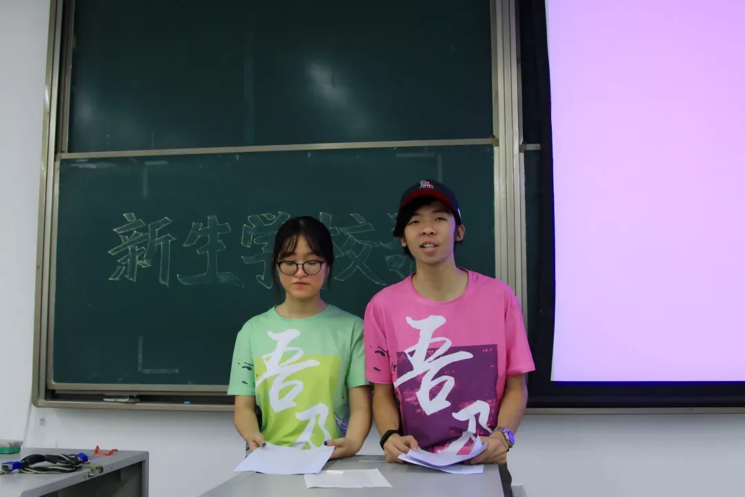 首先,他们帮新同学们了解了校歌背景,同时也是在讲述学校一部分的历史。胡皓量简短地介绍了学校的发展史以及与校歌的每个词语的关系。随后,在视频的播放下,校歌的旋律逐渐响起。接下来便由胡皓量与闵琮惠逐句带领新生们学习校歌的演唱。几番练习之后,网飞猫