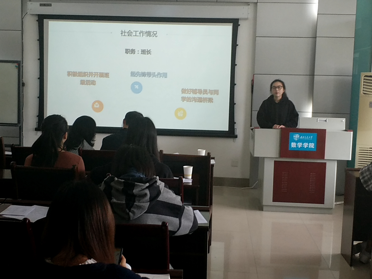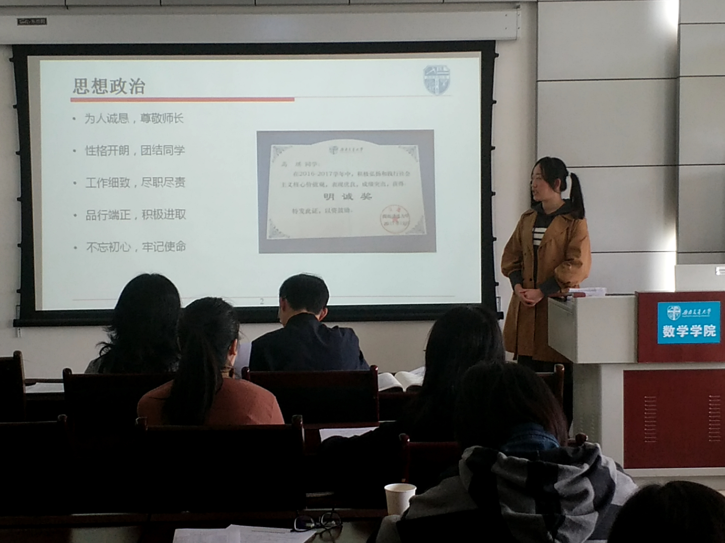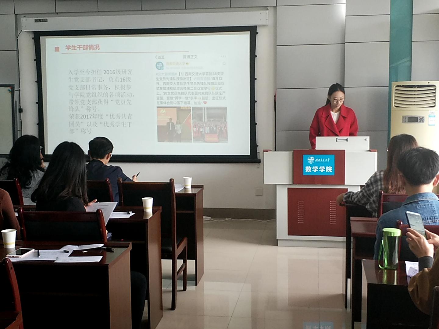 接下来轮到研究生做出答辩。这一环节,首先是研究生标兵答辩,由答辩人王慧霞、高琪、曹宇宇三人展示研究生的个人风采。他们从科学竞赛、社会实践、学习成绩等若干个方向阐述自己身为研究生的杰出方面,展现出他们的个人精神风貌以及优秀的个人综合能力